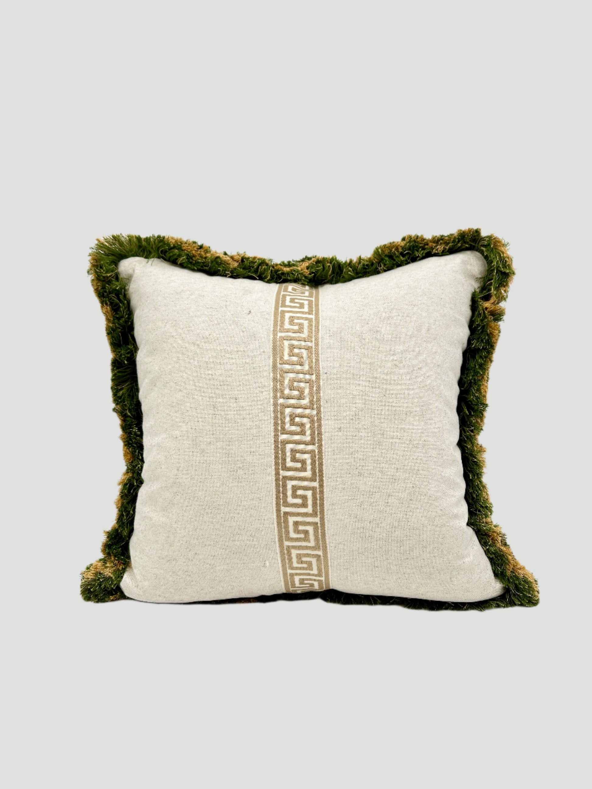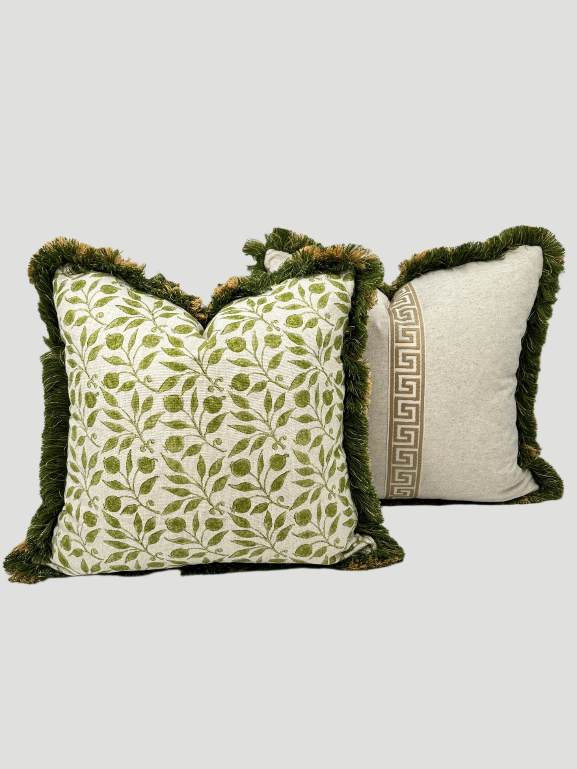 Sanderson Morris & Co. Rosehip Thyme Print on the front. Cream linen with beige vertical Greek key embroidered tape on the back. Multi Tonal brush fringe. 20" x 20". Hidden Zipper Closure. Down Blend Insert.