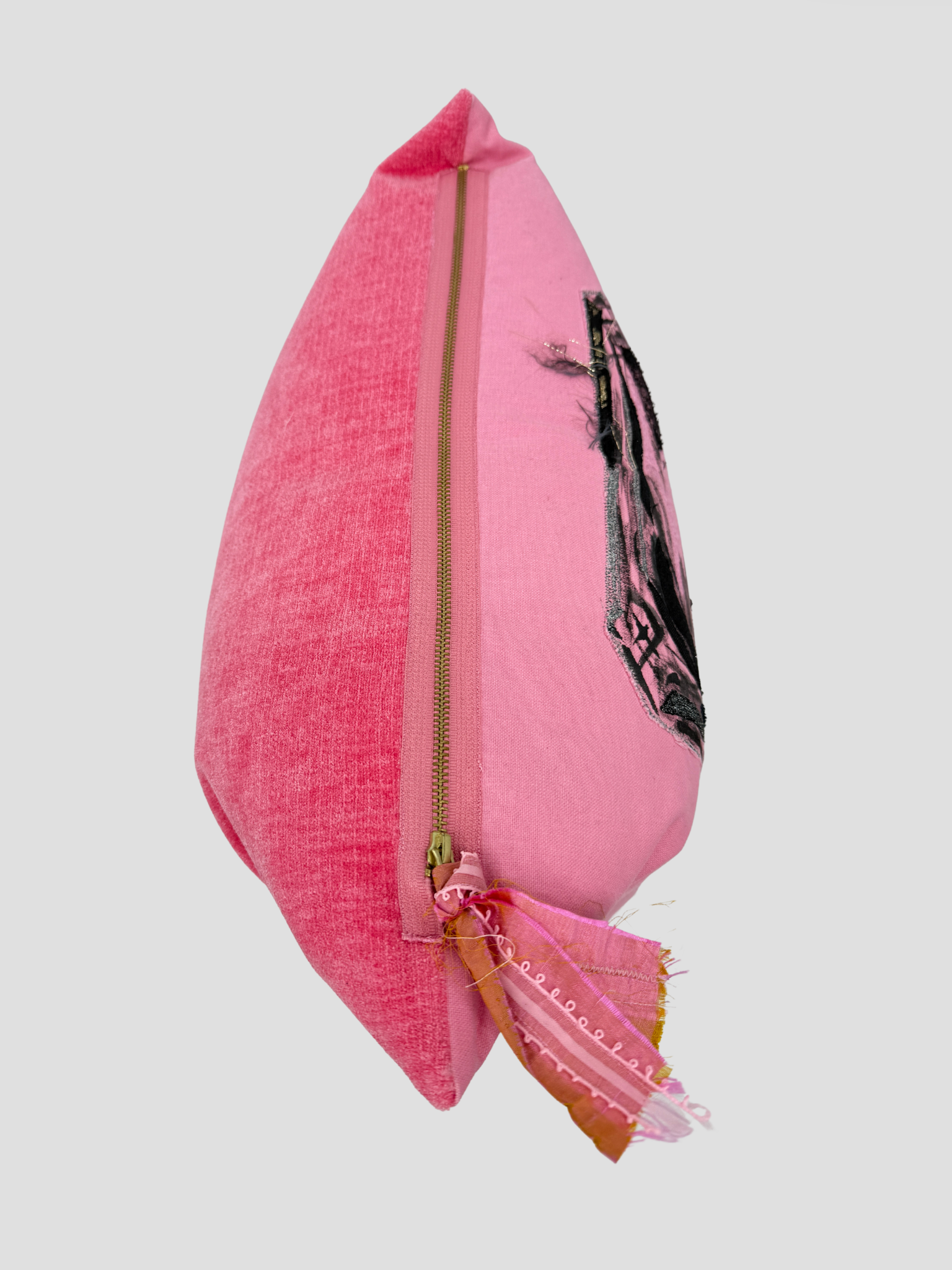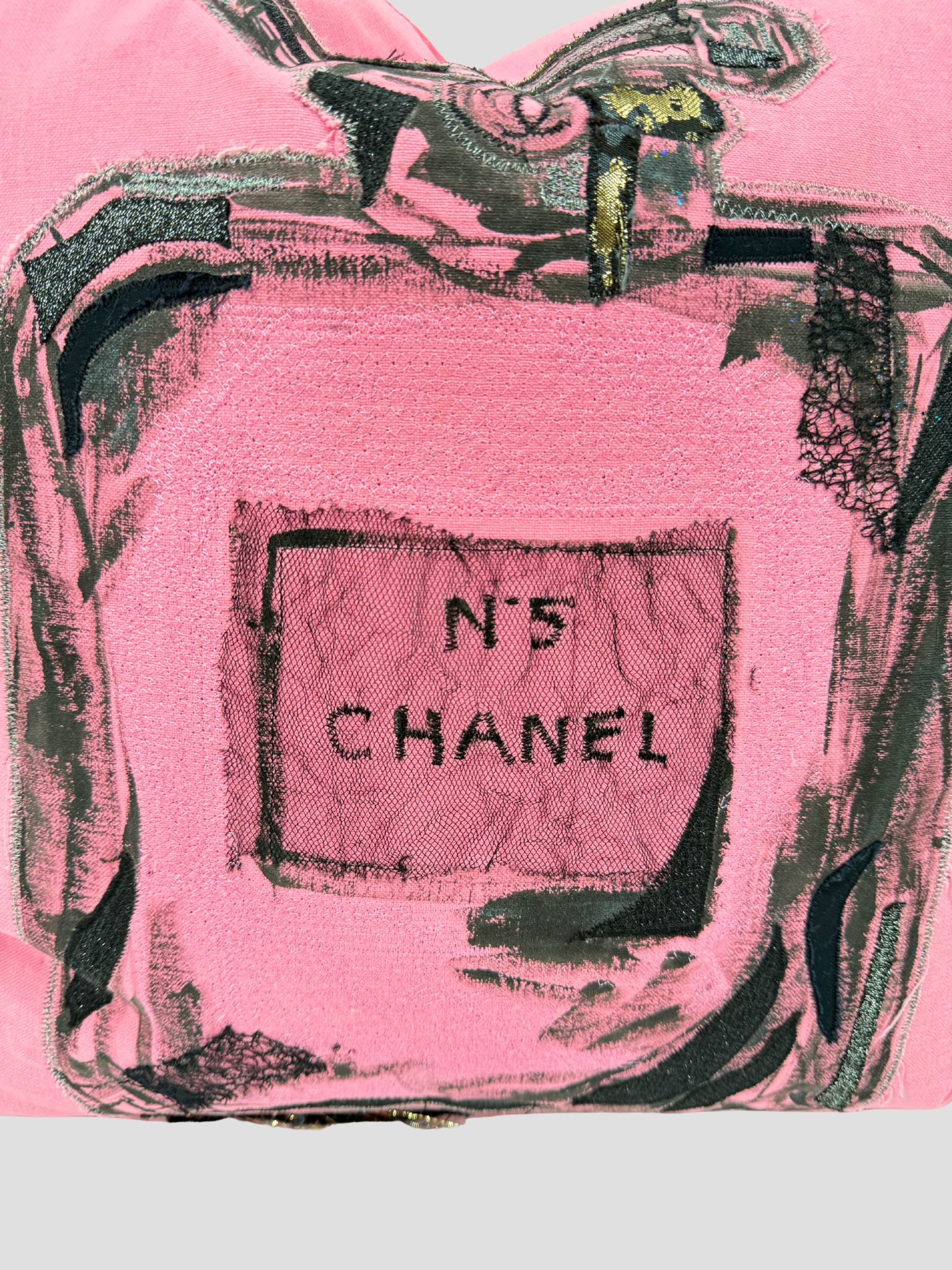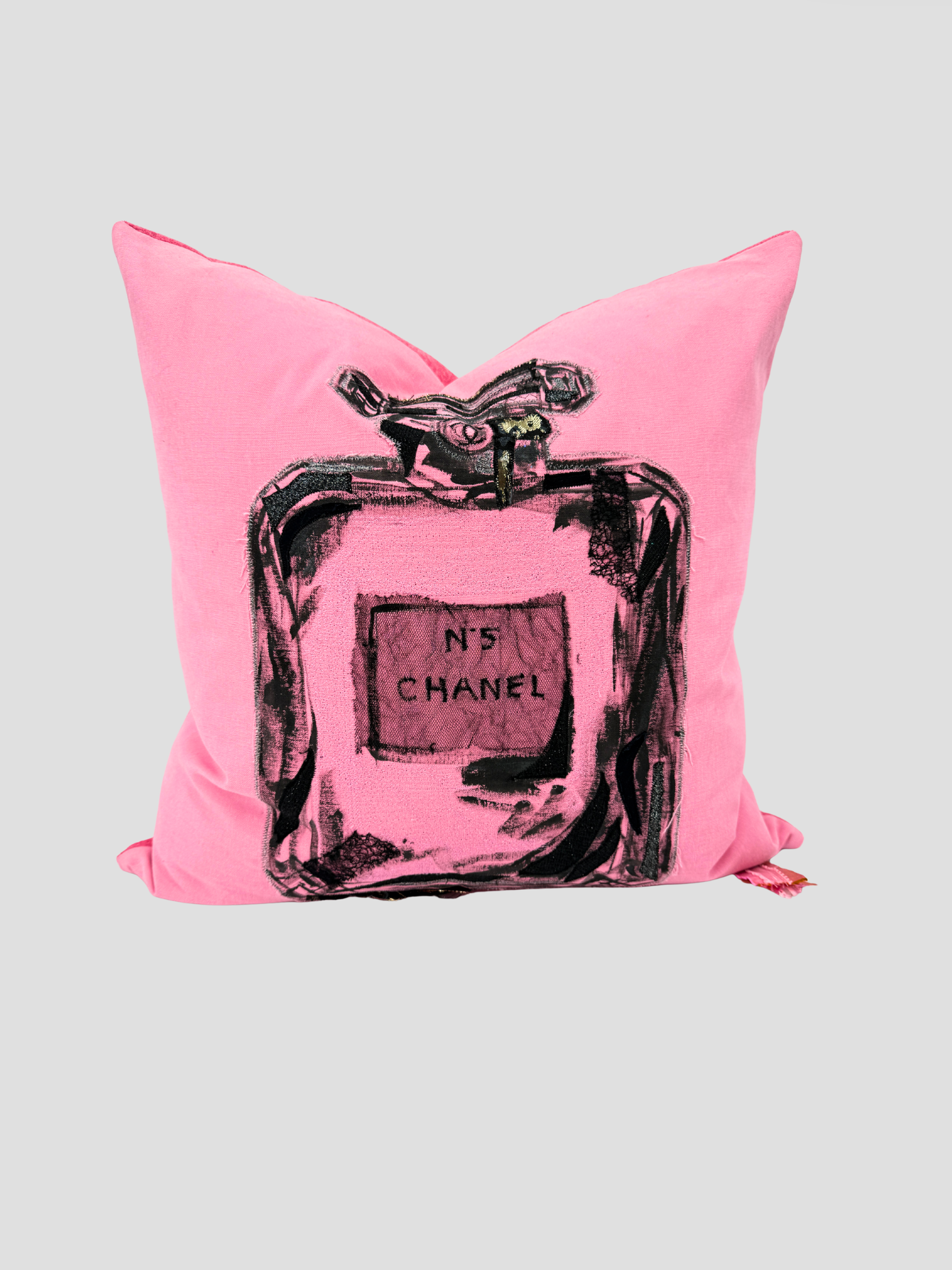 Pink Linen Chanel black hand painted bottle. 20" X 20". Down blend insert.