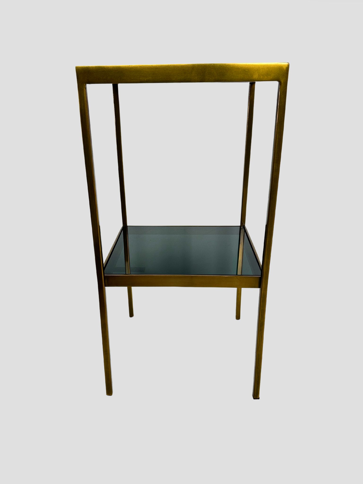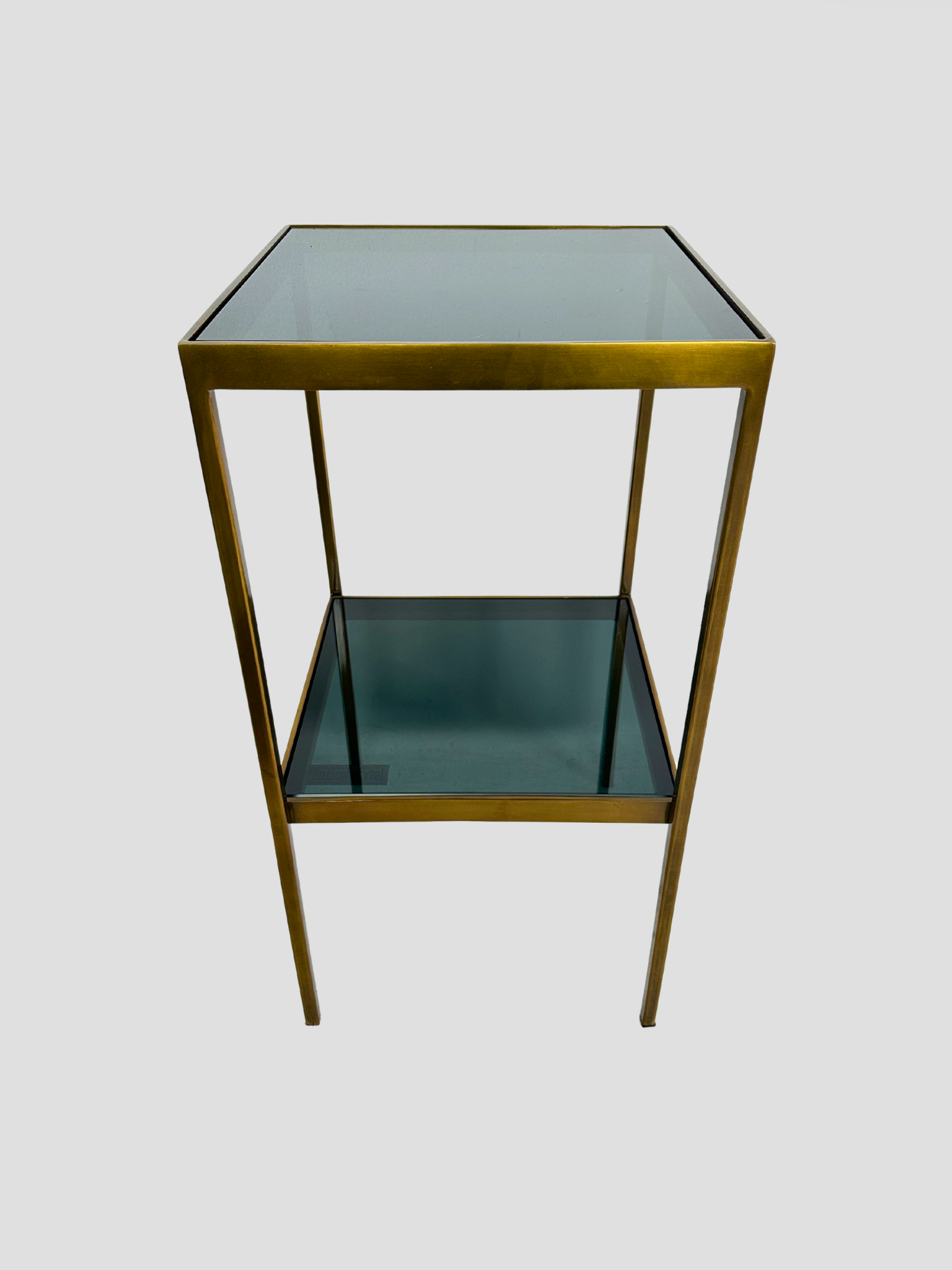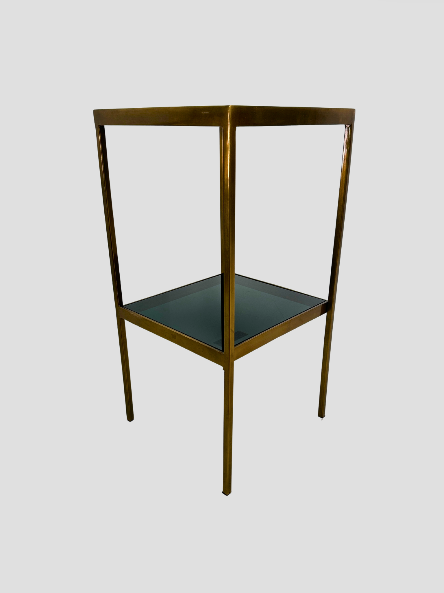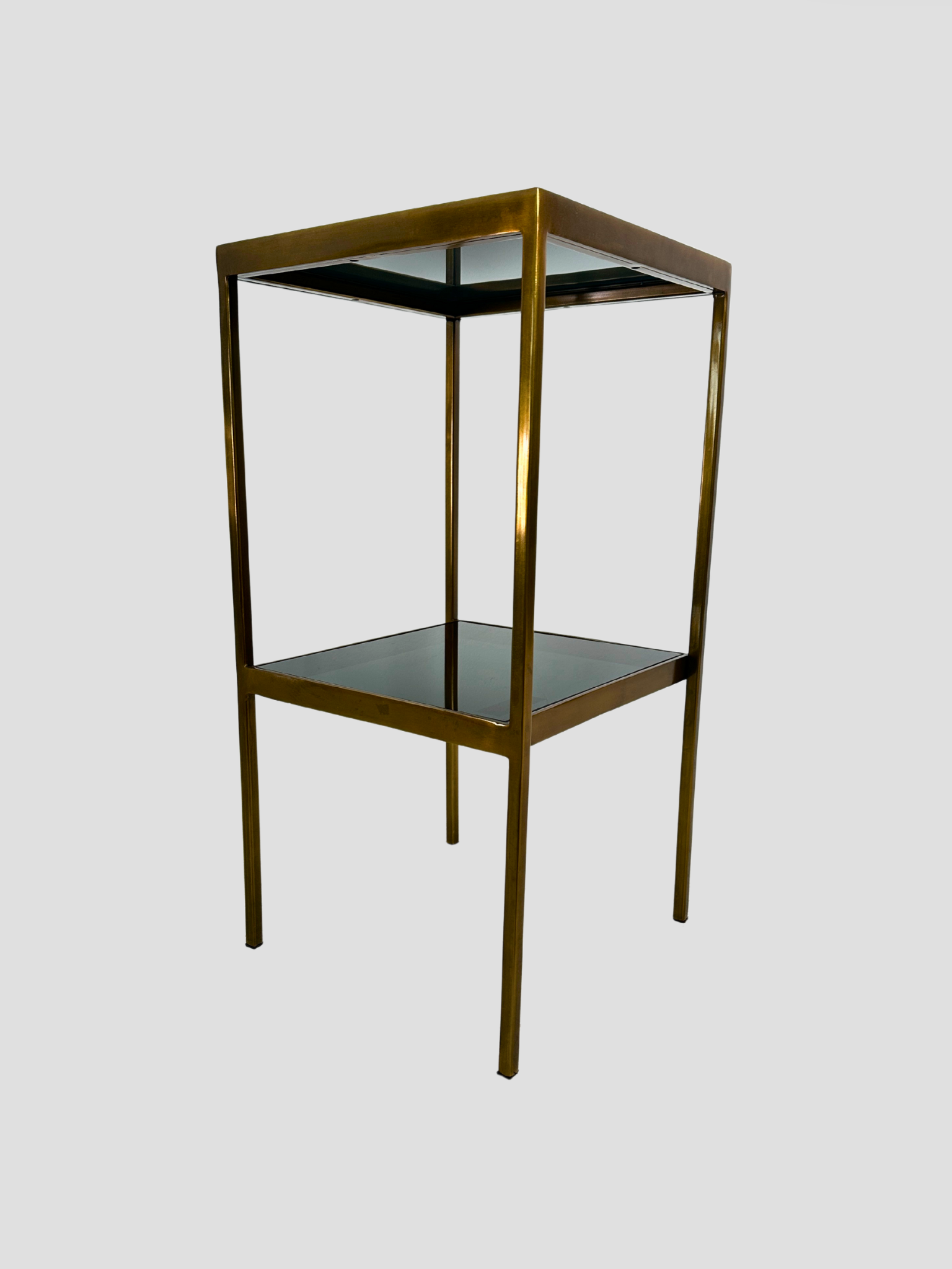 Smoke Glass top and bottom shelf. Brass legs and trim.