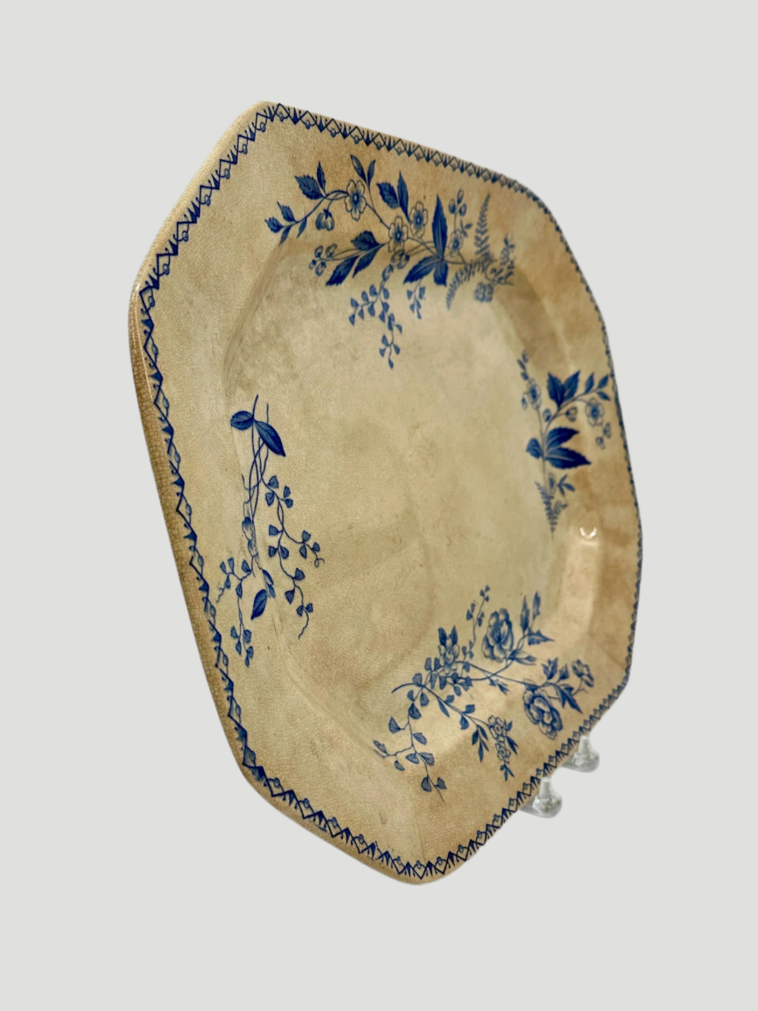 Beautiful antique cream and ink blue serving platter. Hand painted floral designs on the front, with a geometric border. Gorgeous crackling glaze across the platter. Makers mark on the bottom reads "PERSIAN".