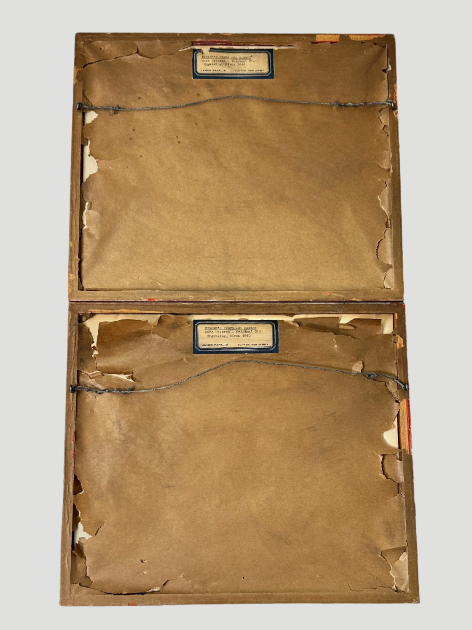 A beautiful set of 2 framed hand colored engravings depicting different European maritime scenes. Each frame mat is hand painted with marbled green, brown and gold - all different, but corresponding. By various artists; these are quite stunning and interesting. Circa 1840.