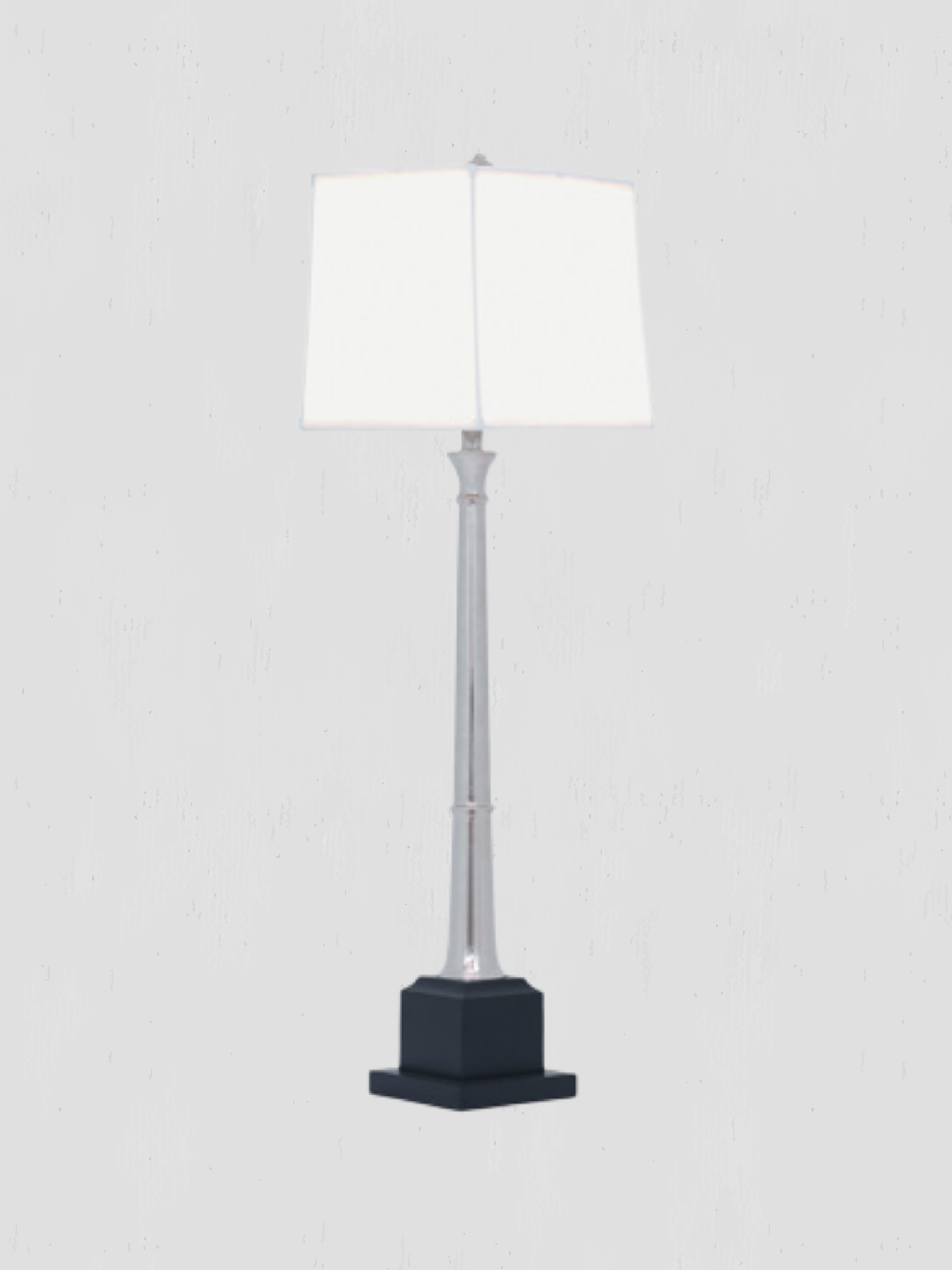 Kensington Buffet Lamp Pair. Made from cast metal and finished in polished nickel, with a matte black base. Rectangle soft back shade.