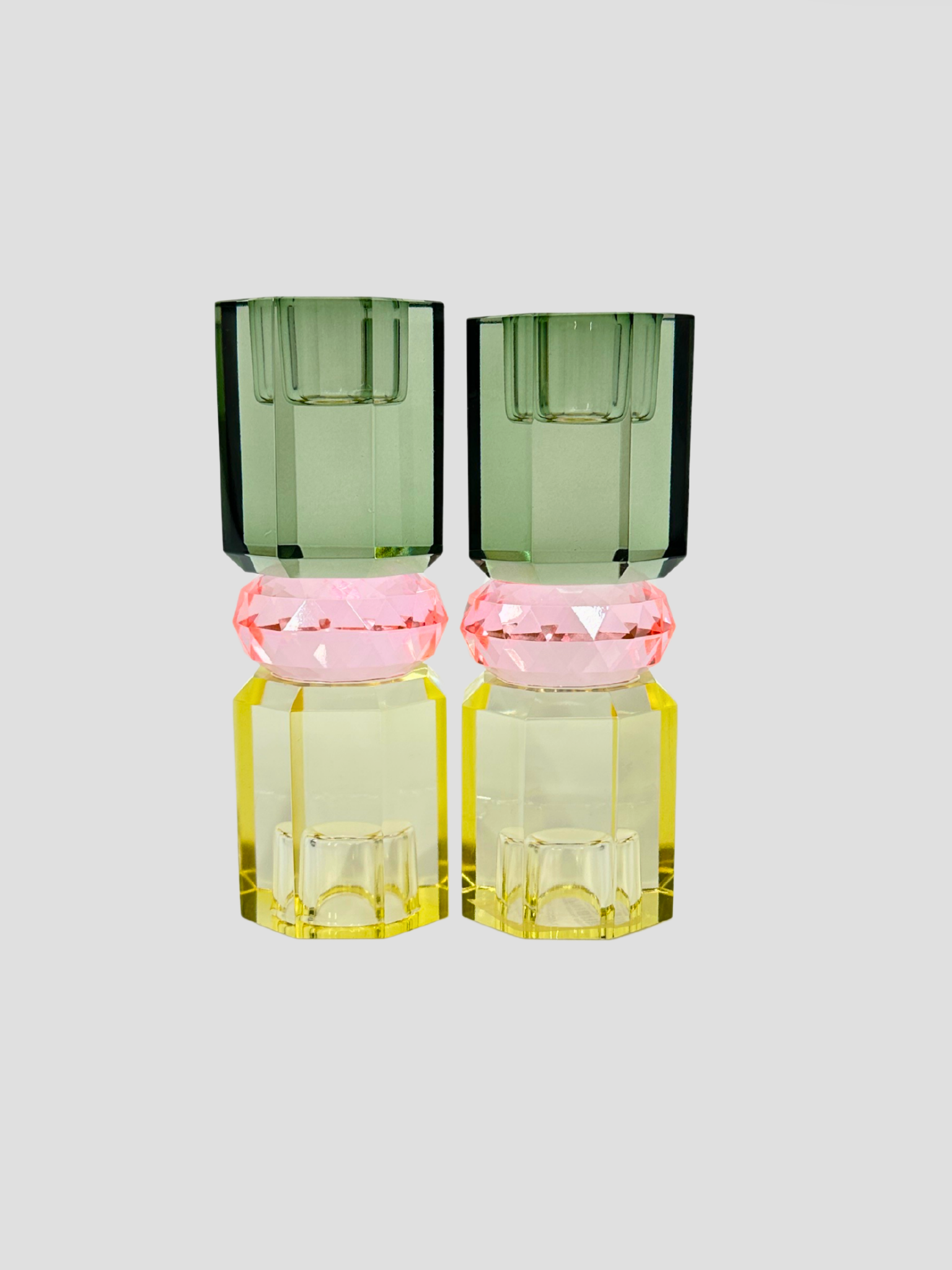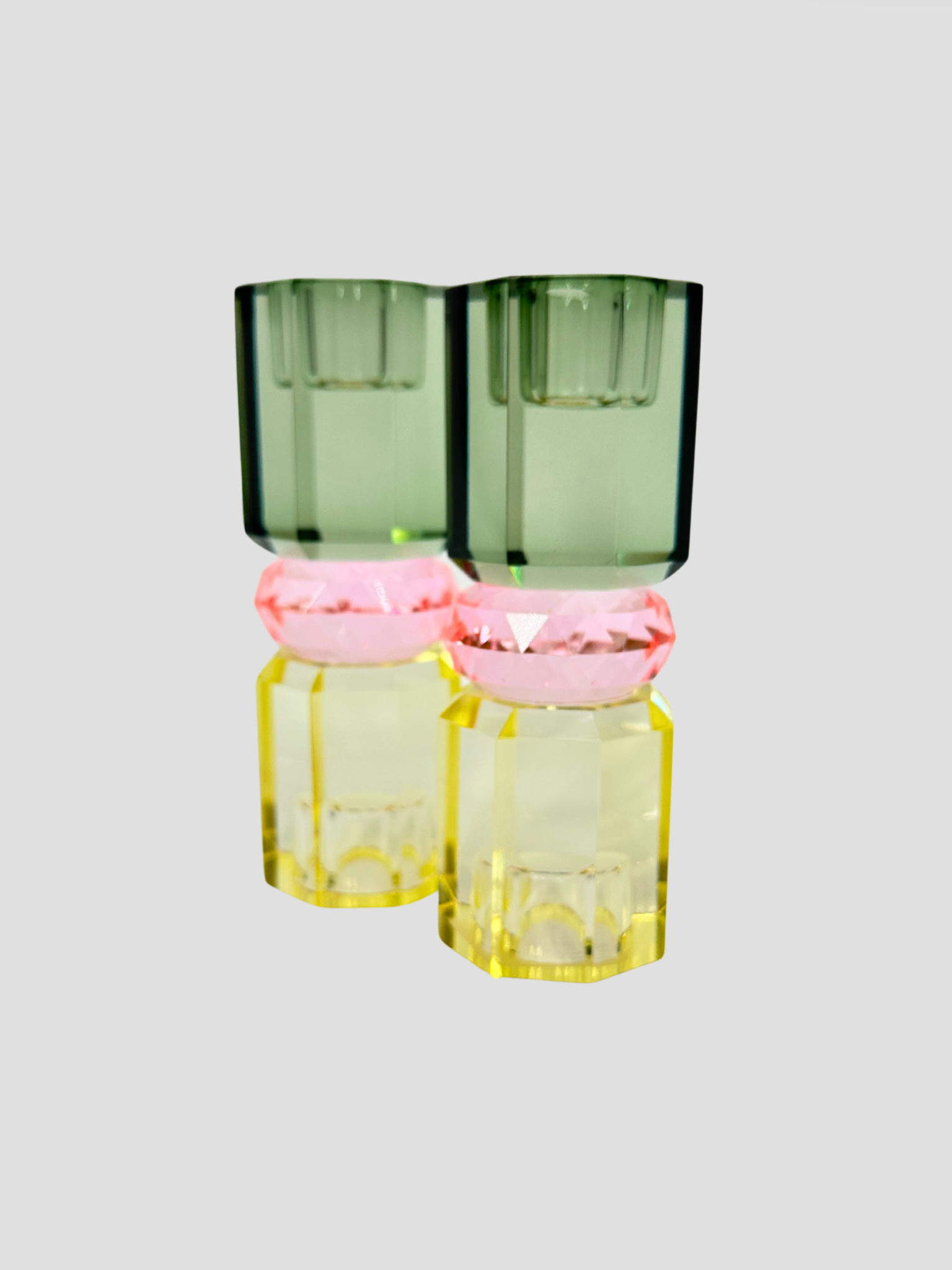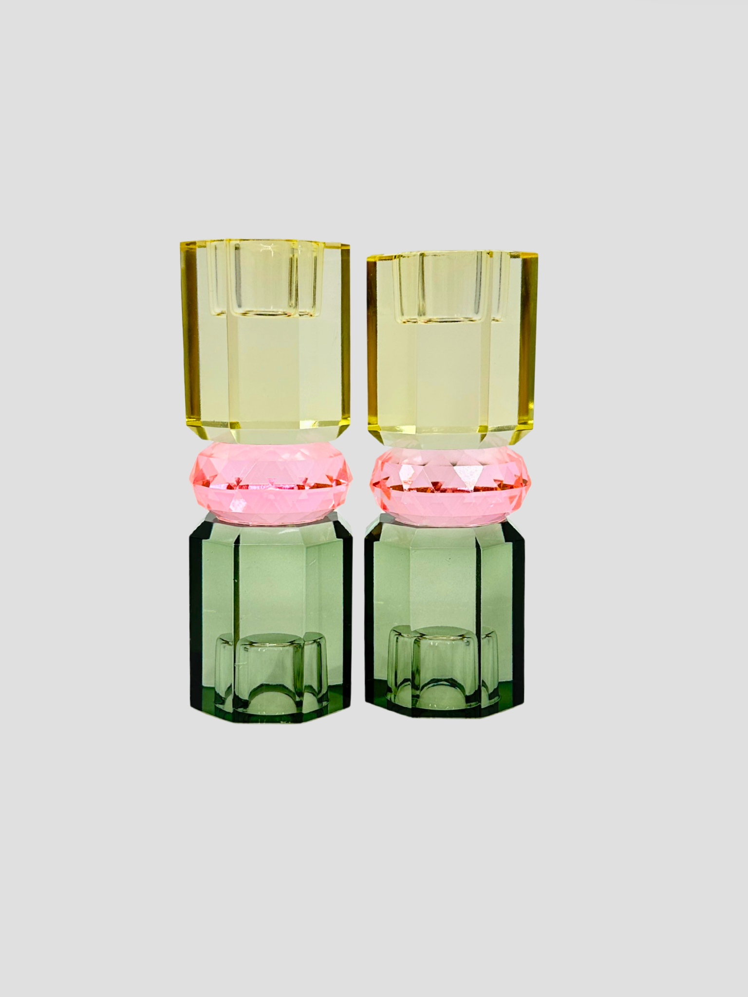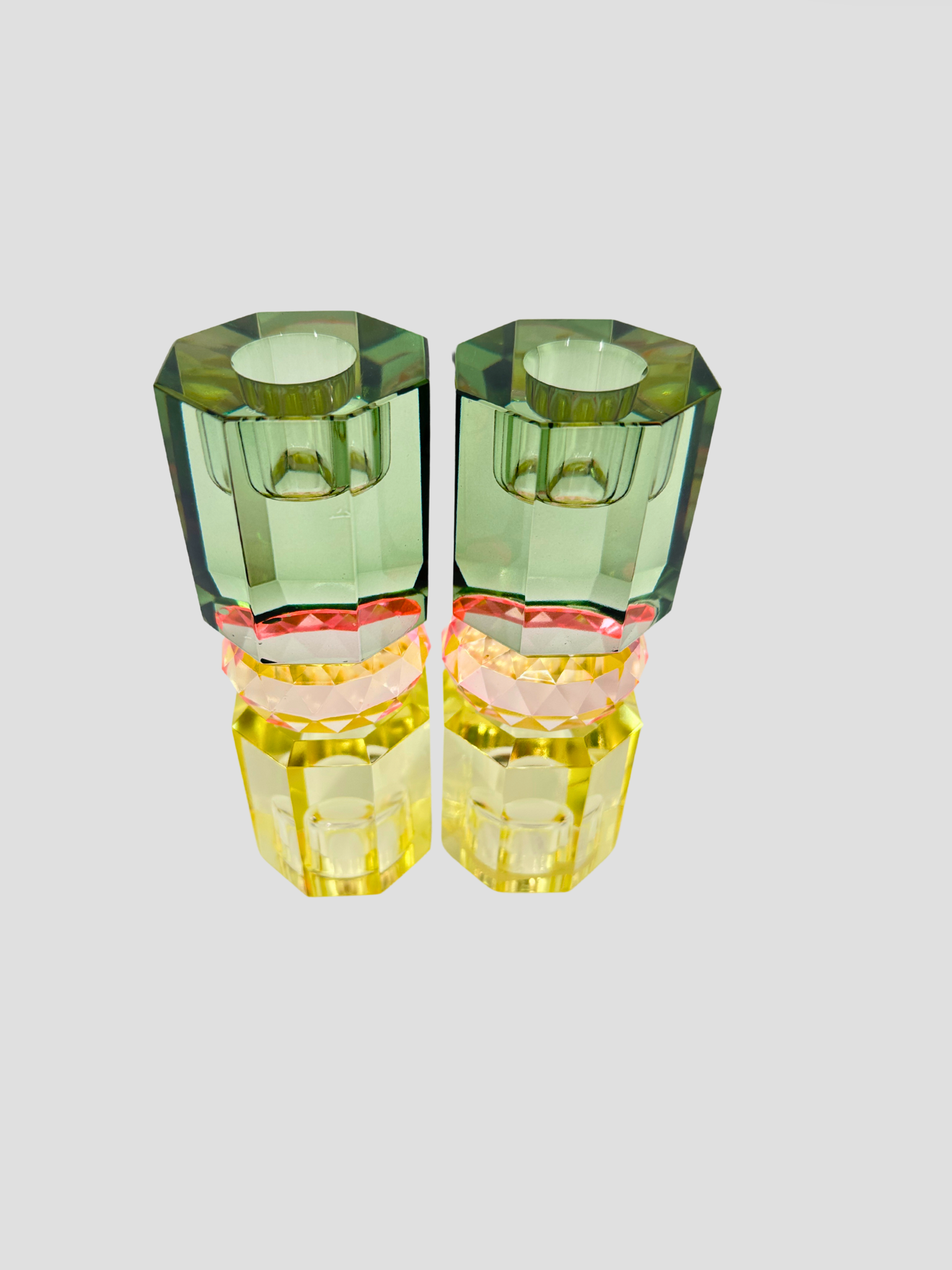Beautiful Danish Faceted Crystal Taper Candle Holder Pair in green, light pink & yellow. These make a lovely addition to your mantle, dining table or coffee table. The candleholder is reversible.