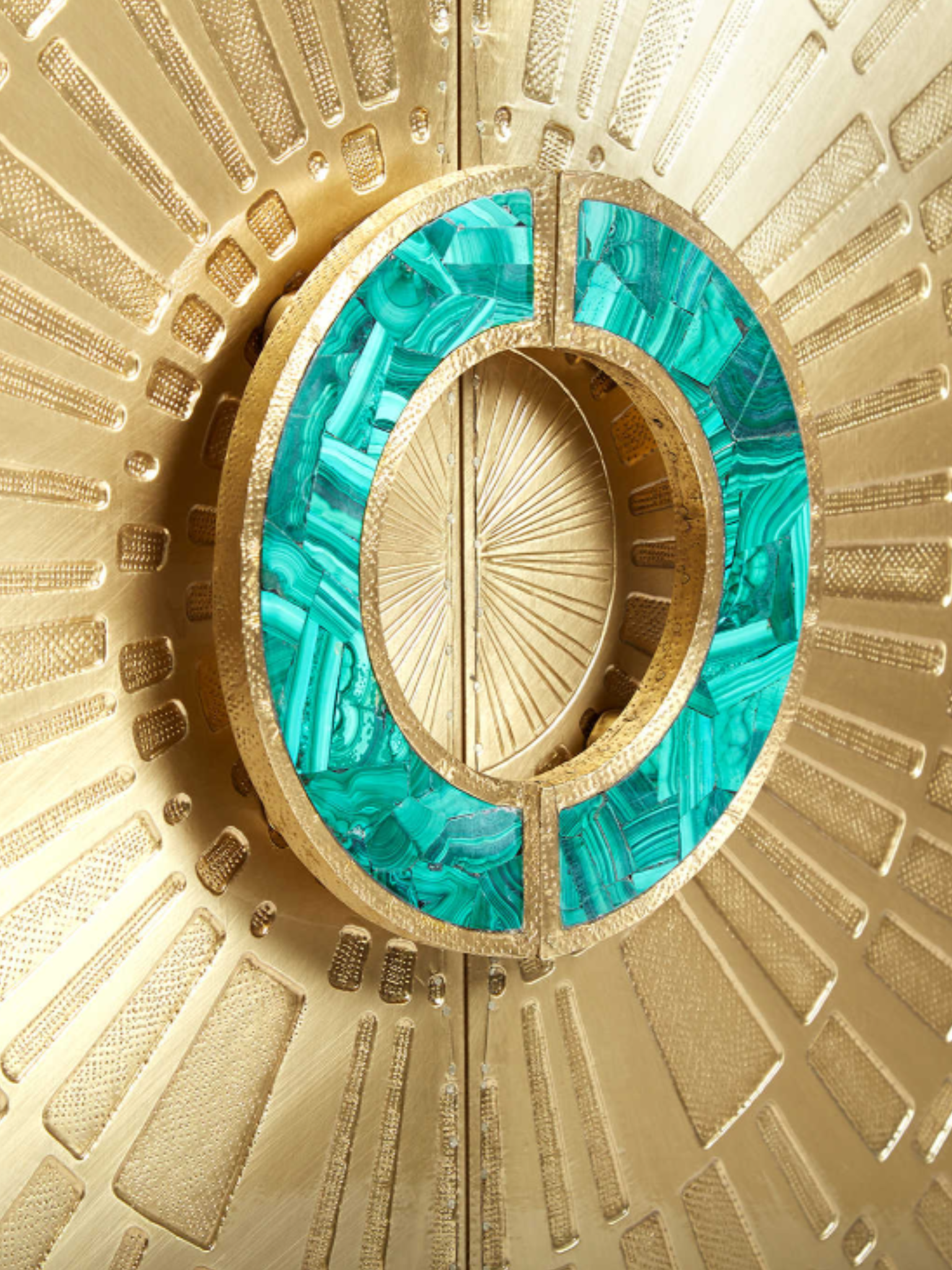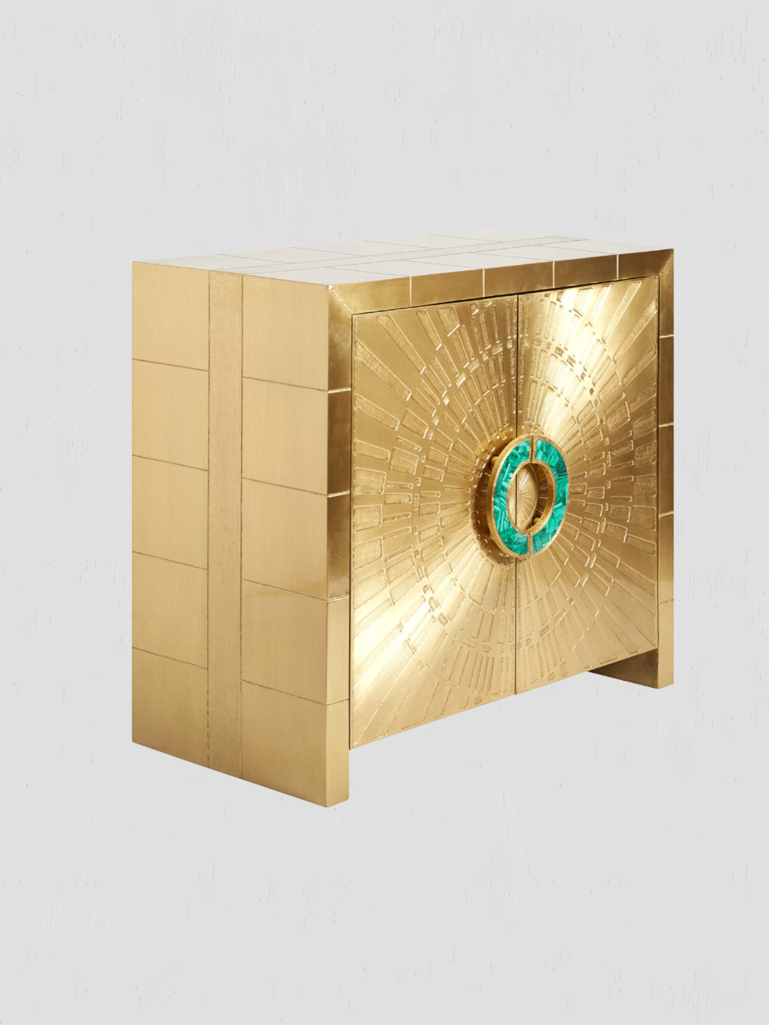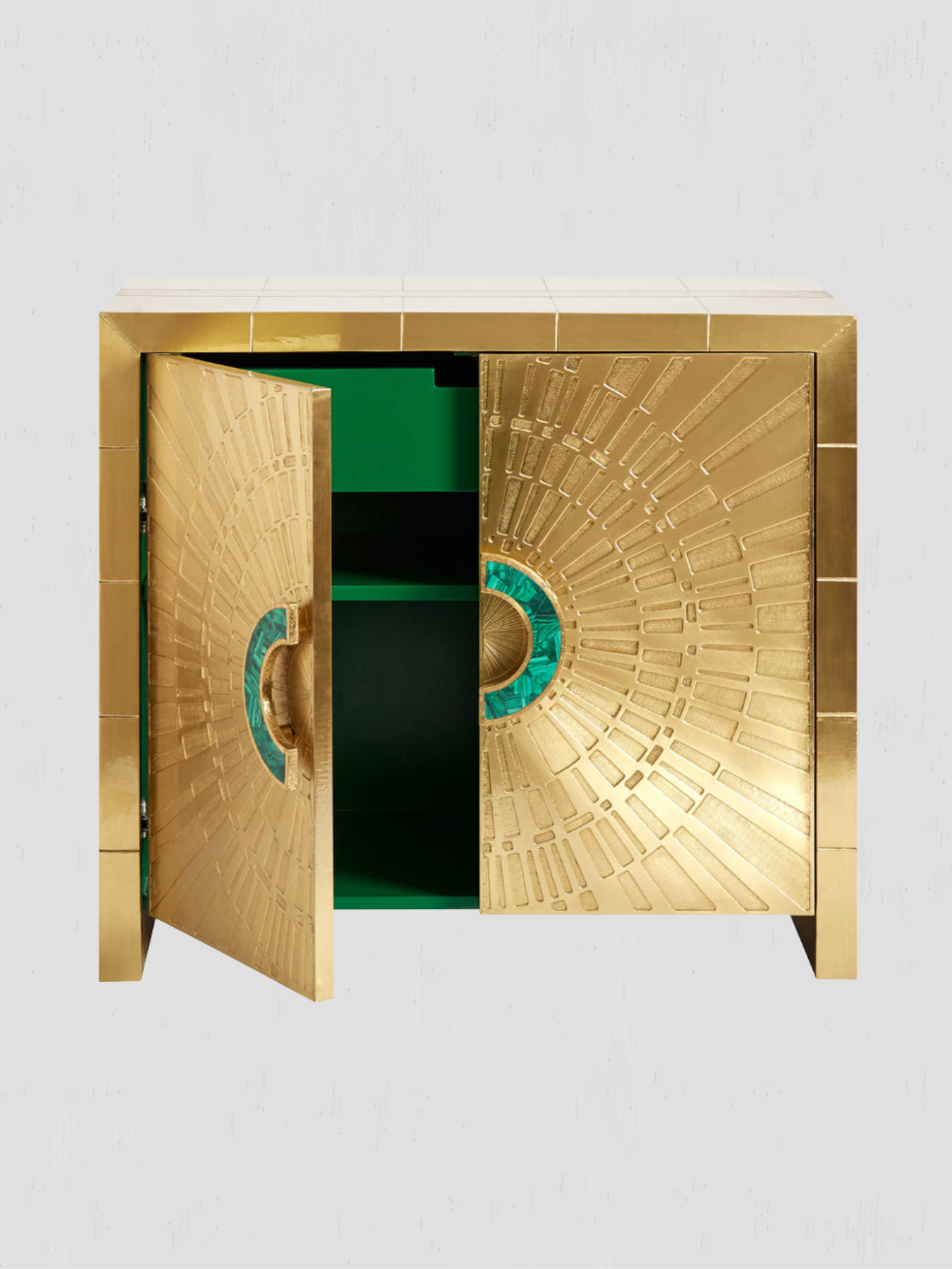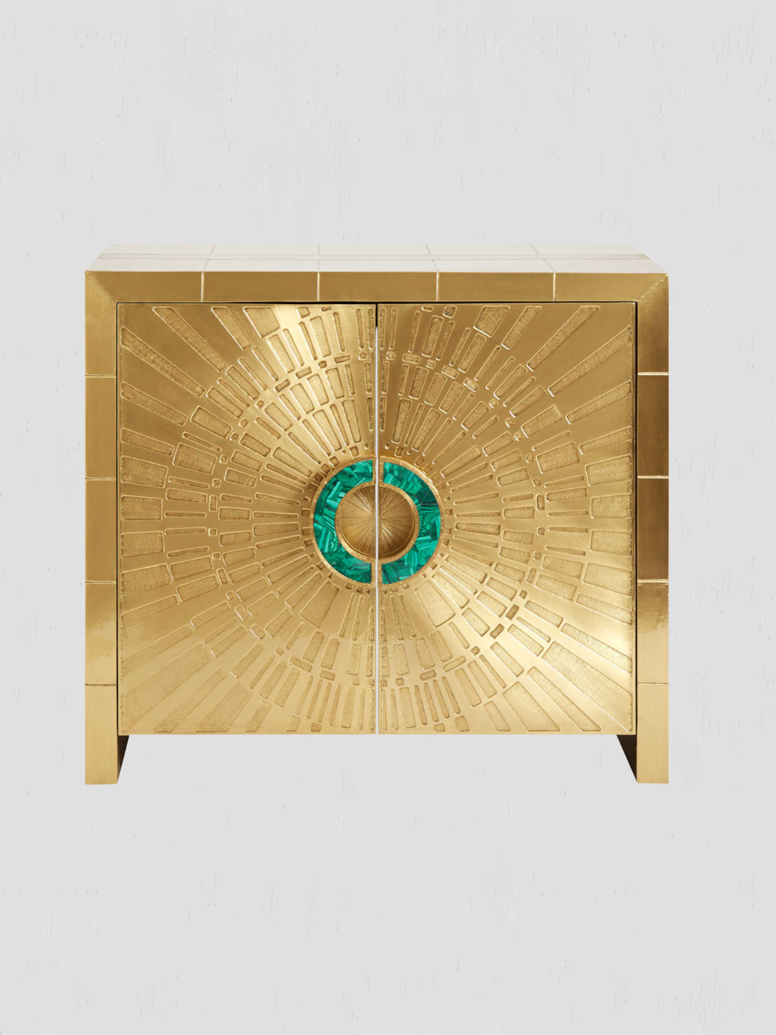 Handcrafted, hand-stamped brass sheets on wood. Natural malachite inlaid handles. Emerald green satin interior with one drawer and one adjustable shelf.