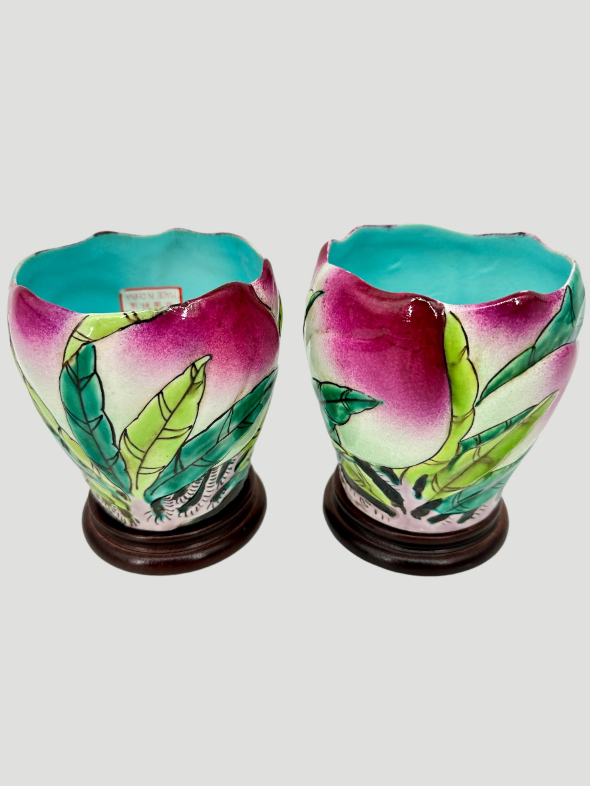 Porcelain in molded peach form, with vibrant peach and leaf decoration.