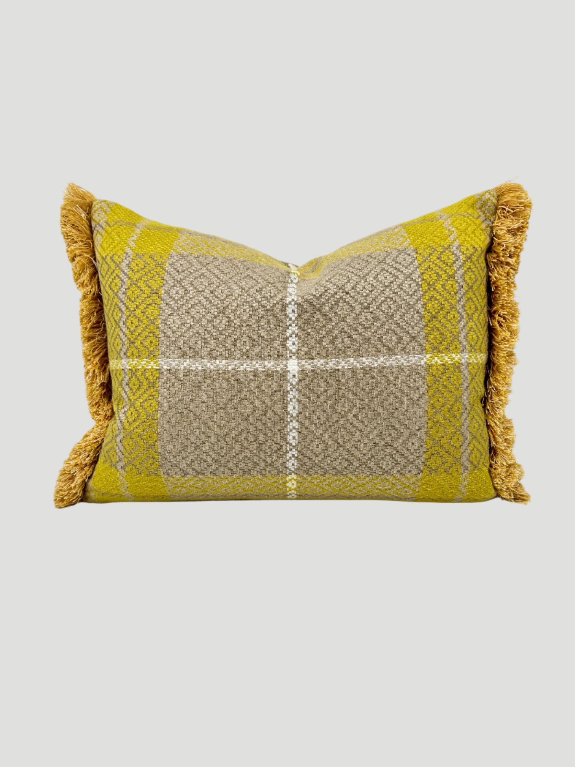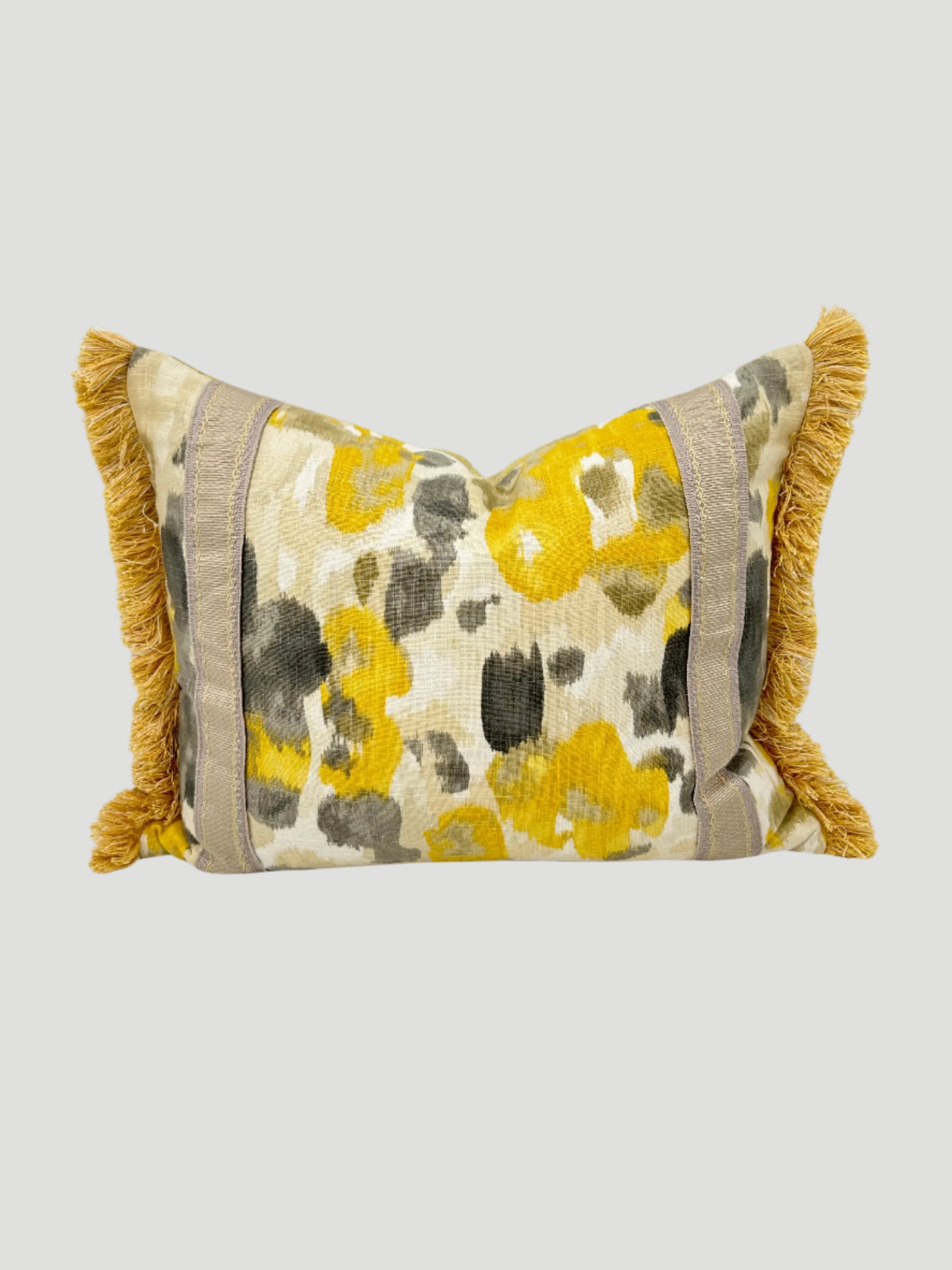 Custom Made Yellow & Gray Linen Lumbar Pillow. Yellow and gray linen abstract print front with double vertical grosgrain stripes. Textured yellow and gray plaid back. Multi tonal yellow fringe on two sides. Hidden zipper closure. Down Blend Insert. 20" x 16".