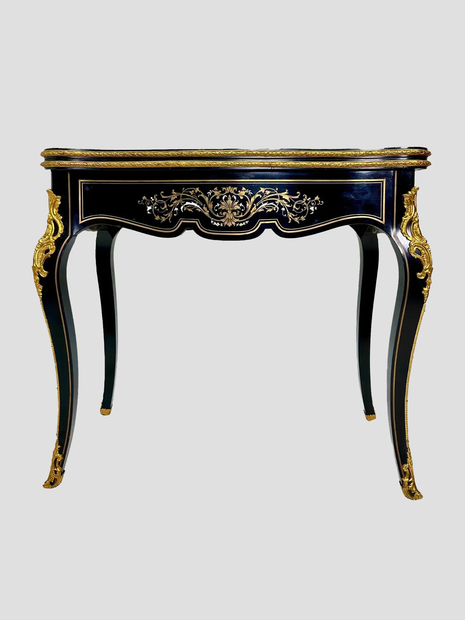 Late 19th Century Napoleon III Flip Top table a jeu (game table). Black lacquered wood. Beautifully hand carved mother-of-pearl and bronze marquetry motif top and apron depicting acanthus leaves, bouquets, scrolls, trailing foliate, and floral arabesques. Finely cast ormolu mounts adorning the shoulders trailing down to the feet, with tapering cabriole legs.