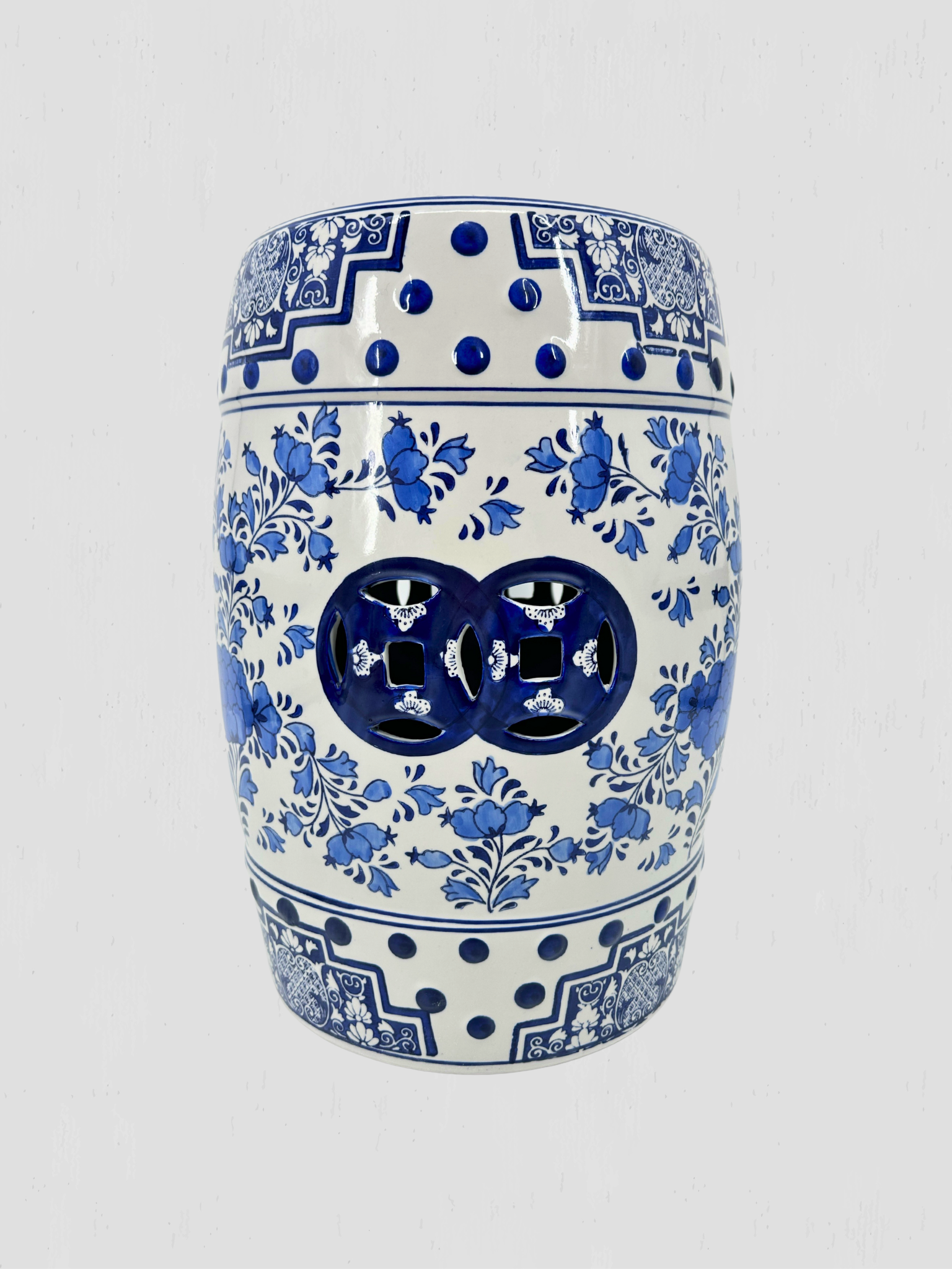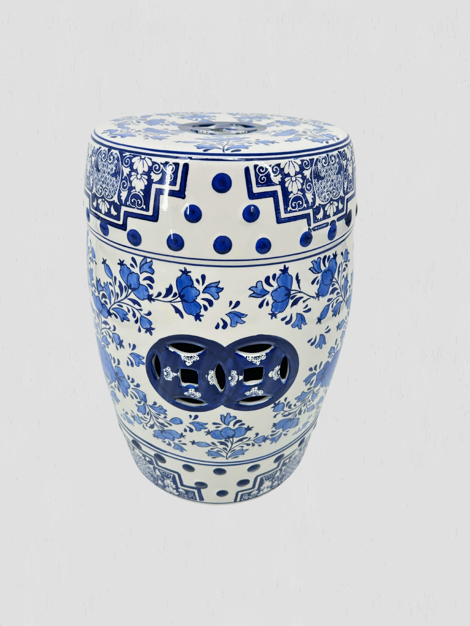 Chinoiserie blue and white ceramic garden stool.