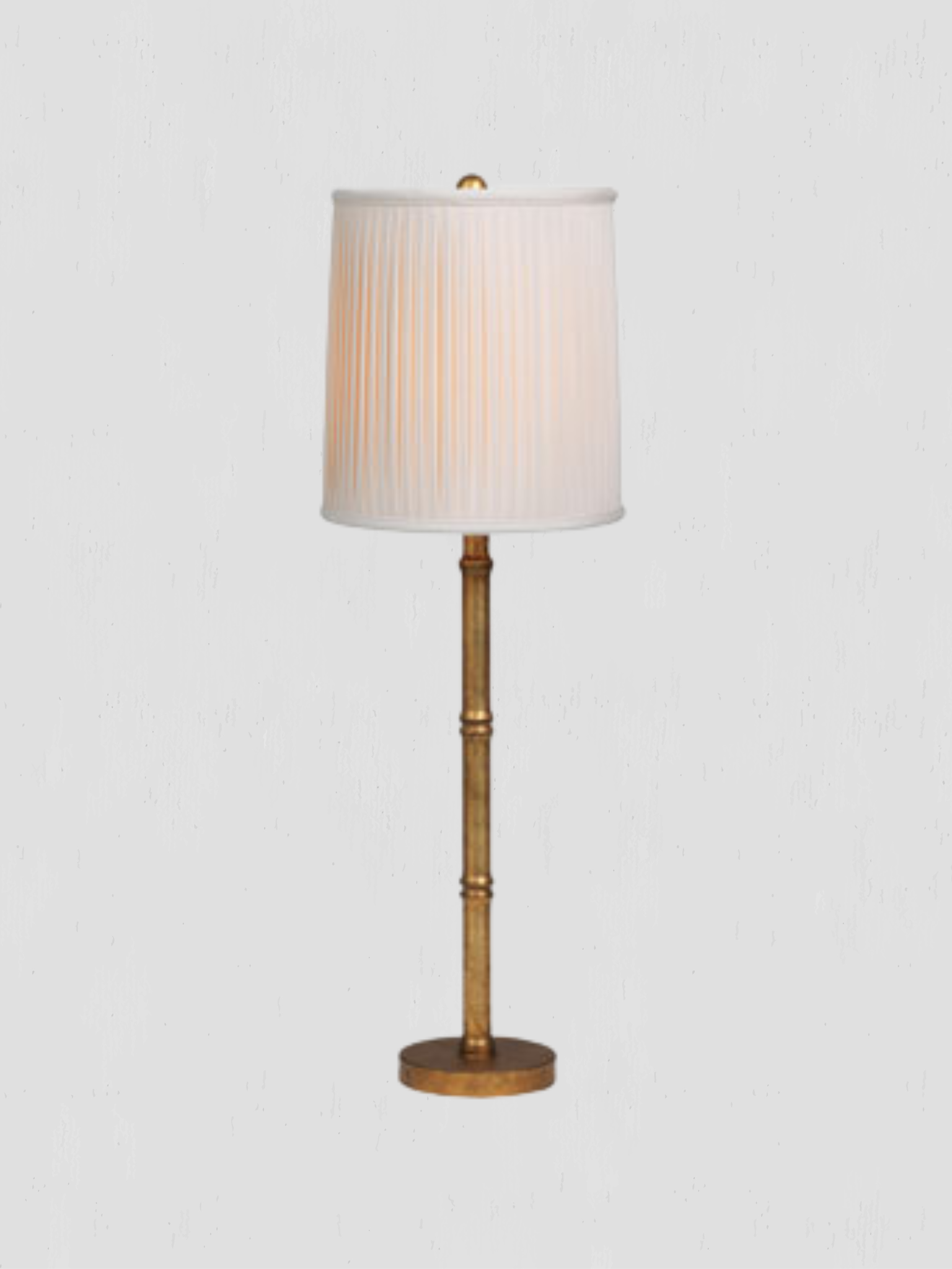 Lauderdale buffet lamp features metal bamboo turnings and hand applied antiqued gold leaf. Metal ball finial.
