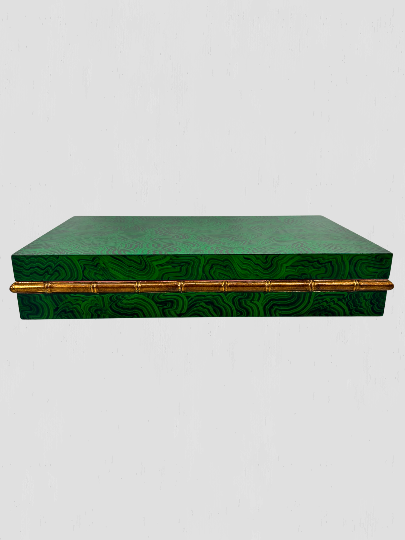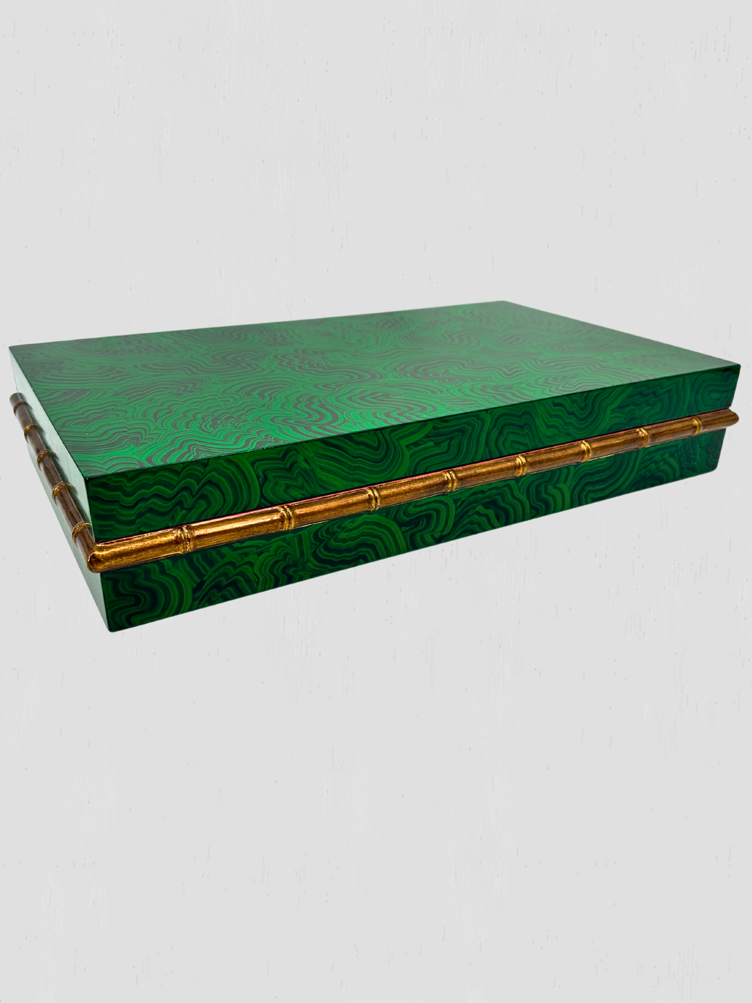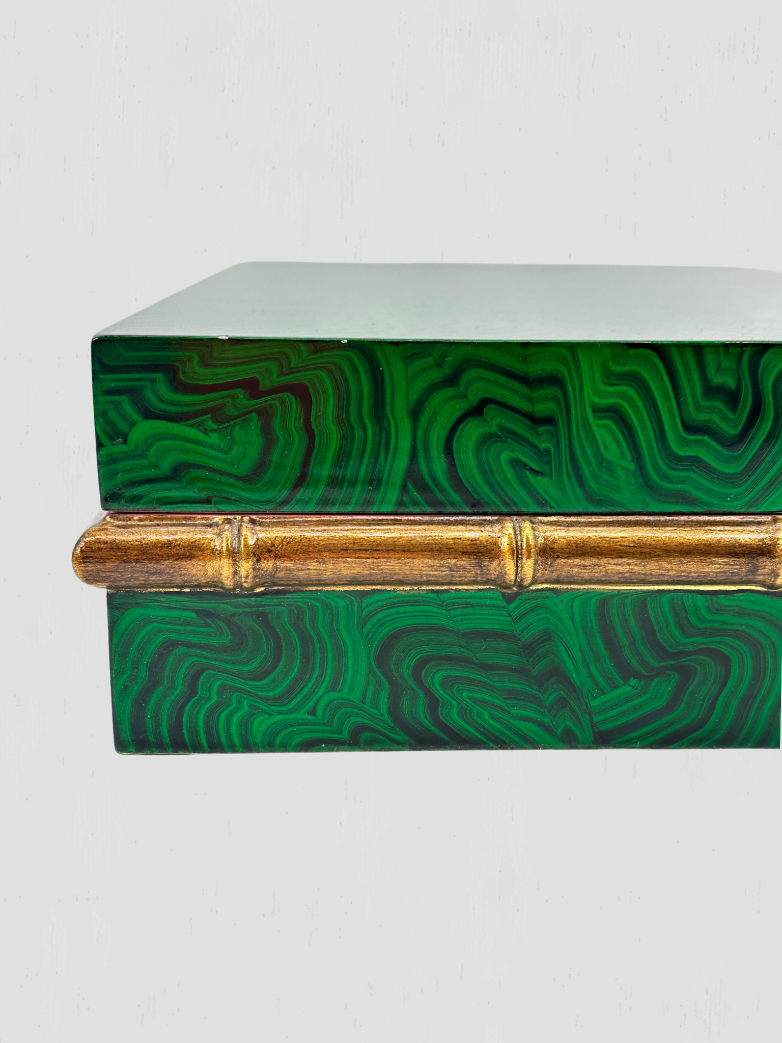 Beautiful Large Malachite Bamboo Box with lid. Gold painted bamboo detail.