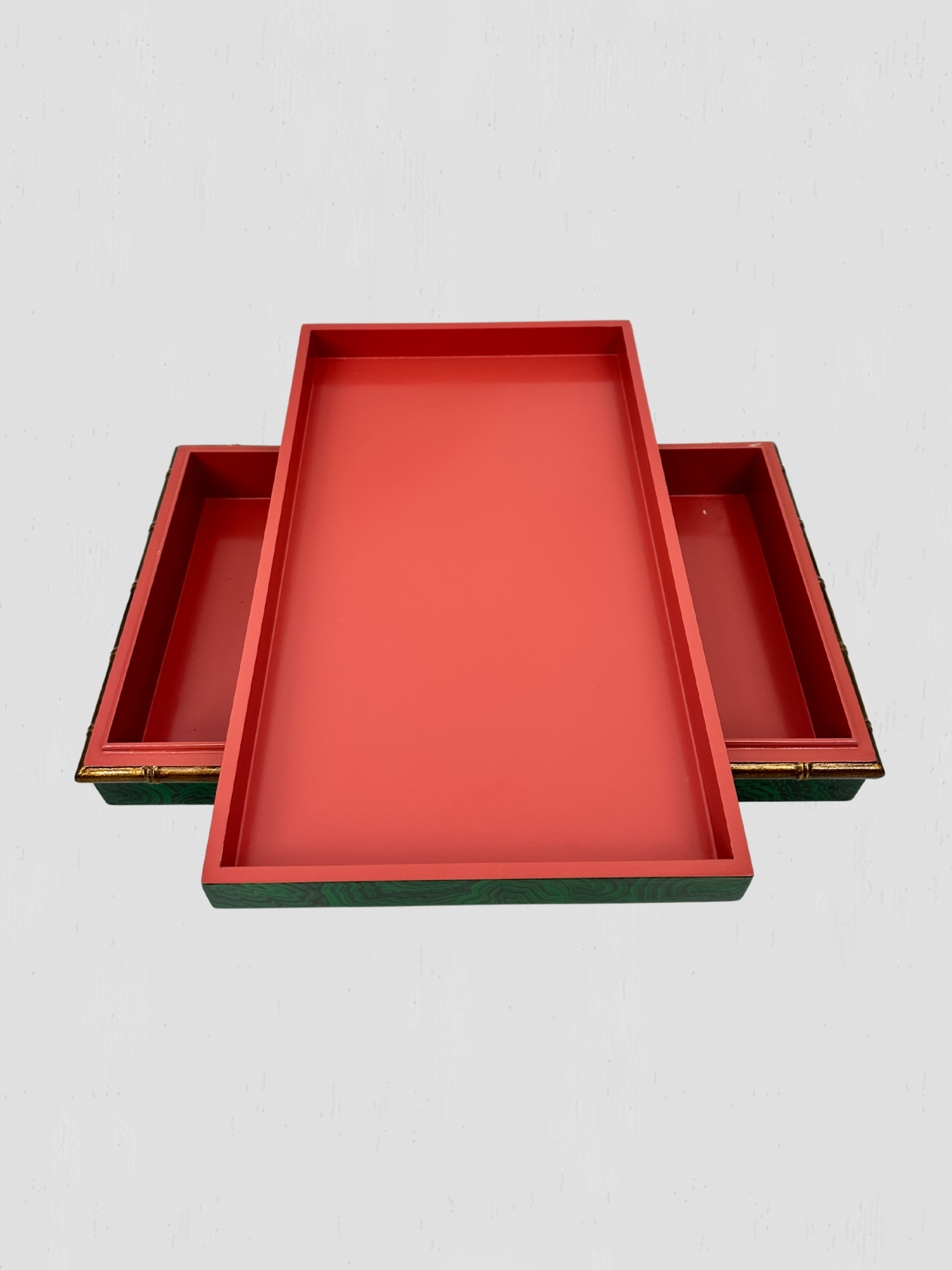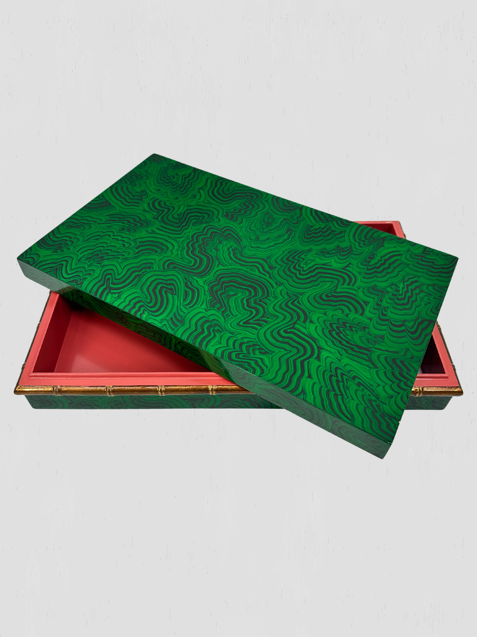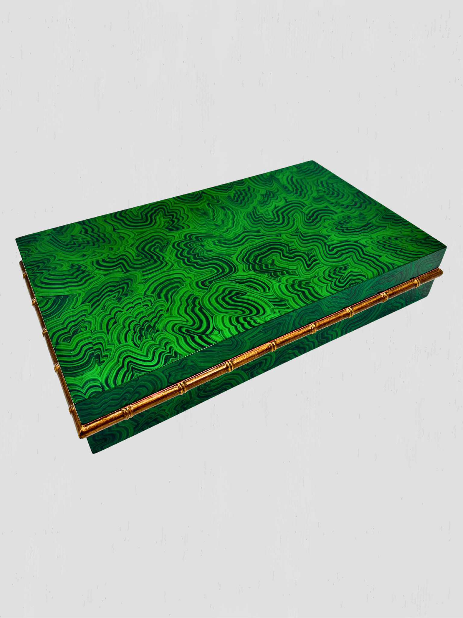 Beautiful Large Malachite Bamboo Box with lid. Gold painted bamboo detail.