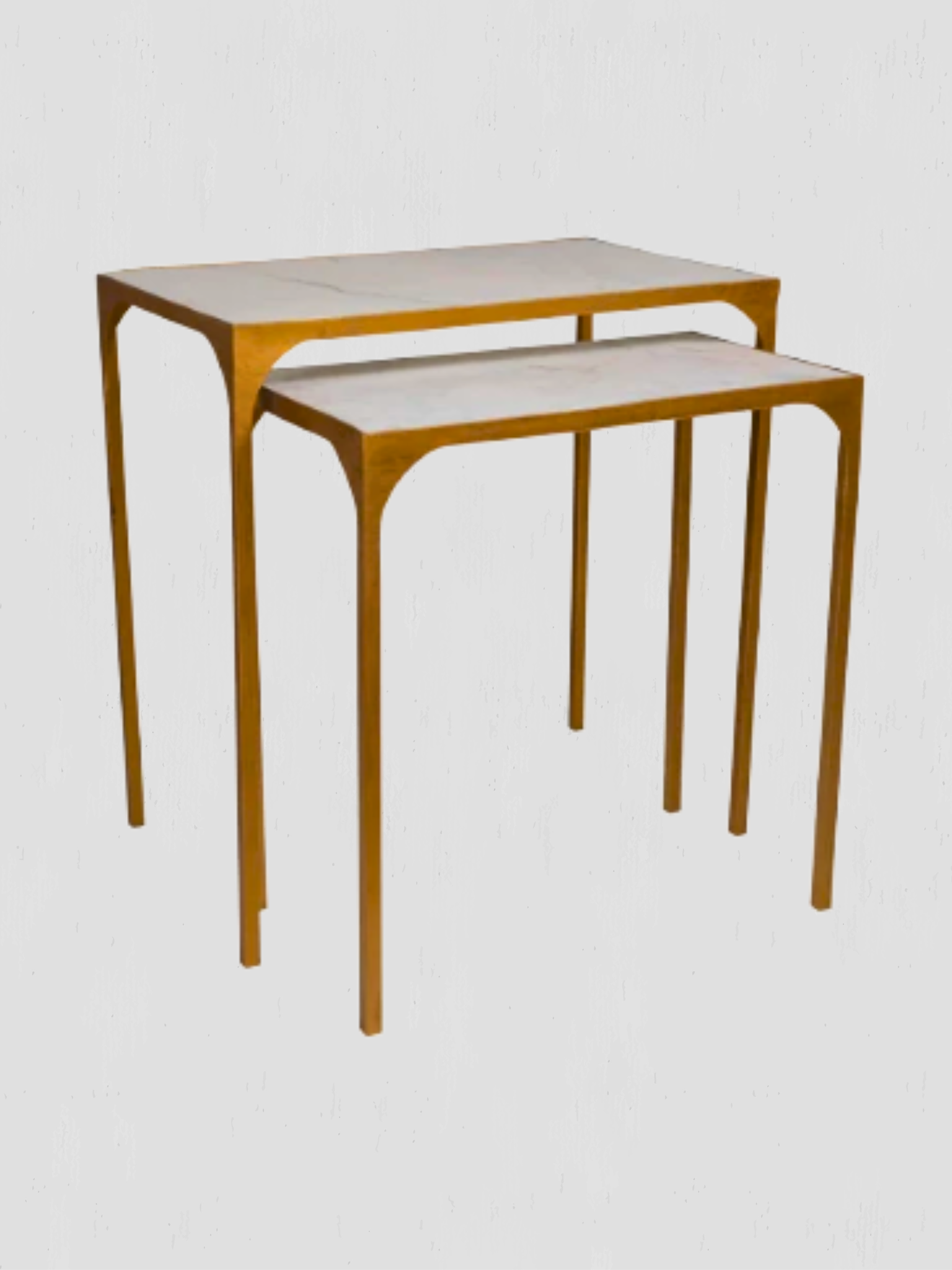Duplex Side Nesting Tables in Antique Gold. White marble tops.
