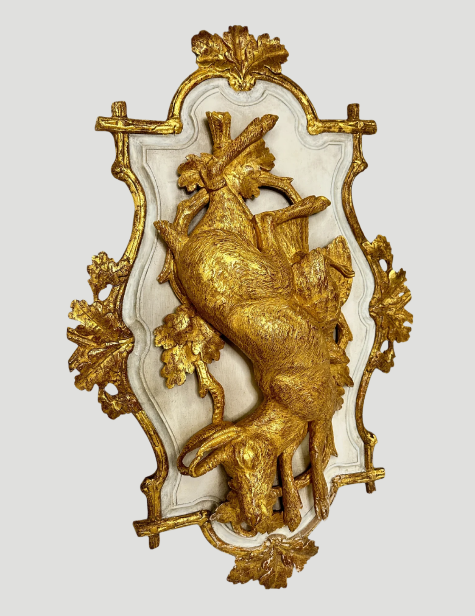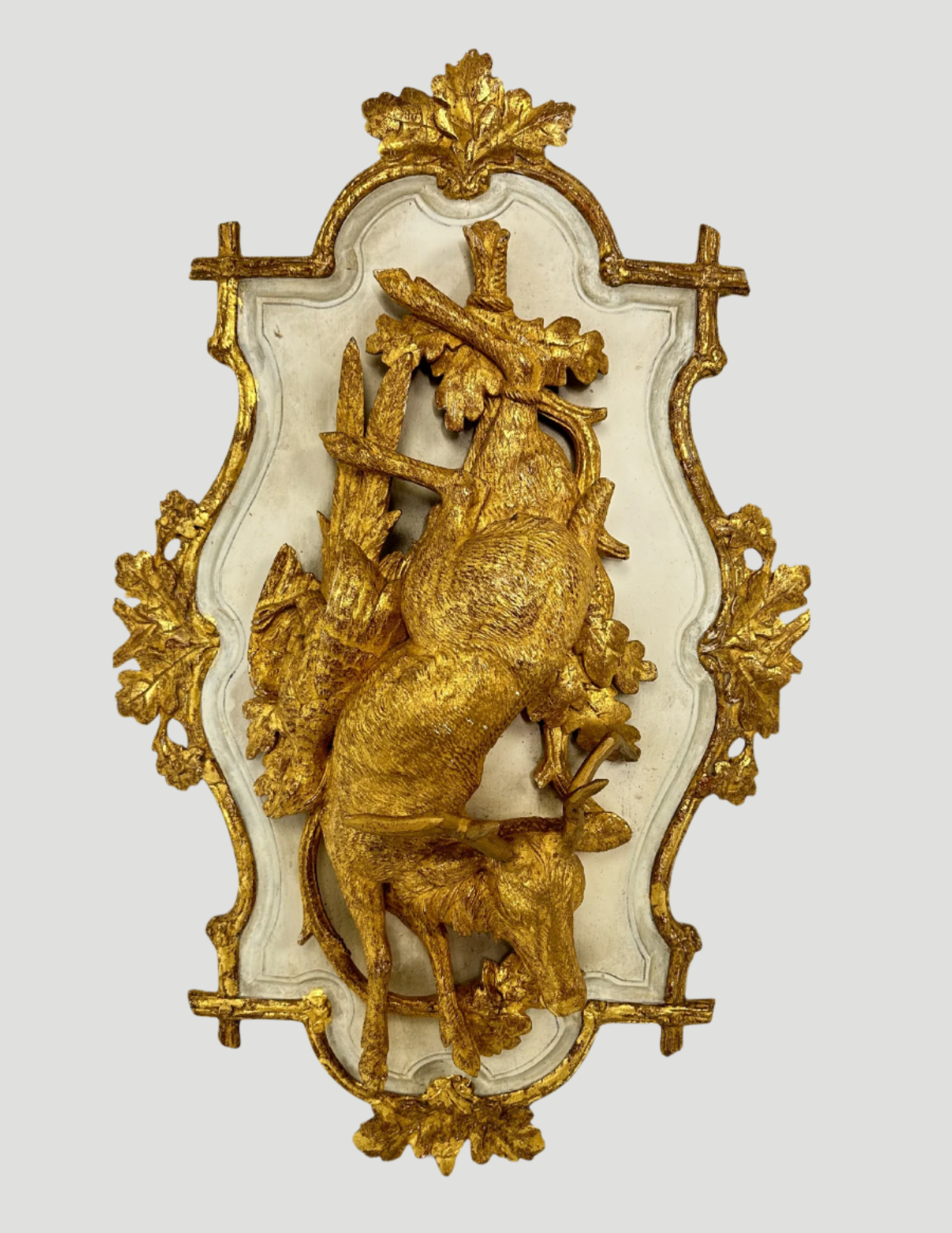 Beautiful matched pair of Gilt Hanging Wooden Carved Plaques. Depicting a meticulously detailed hunting scene of a stag and a pheasant, framed by oak leaves and foliage.