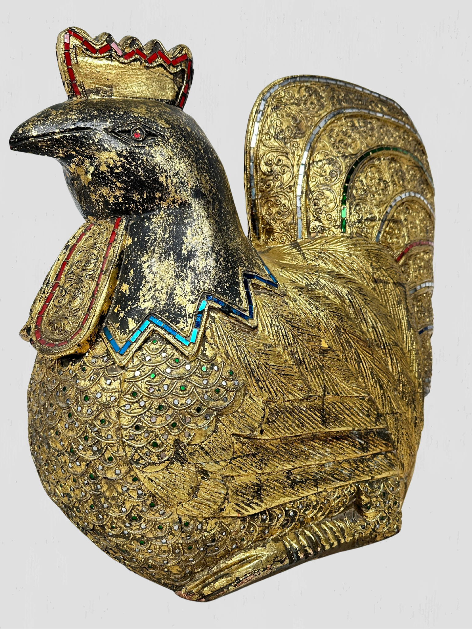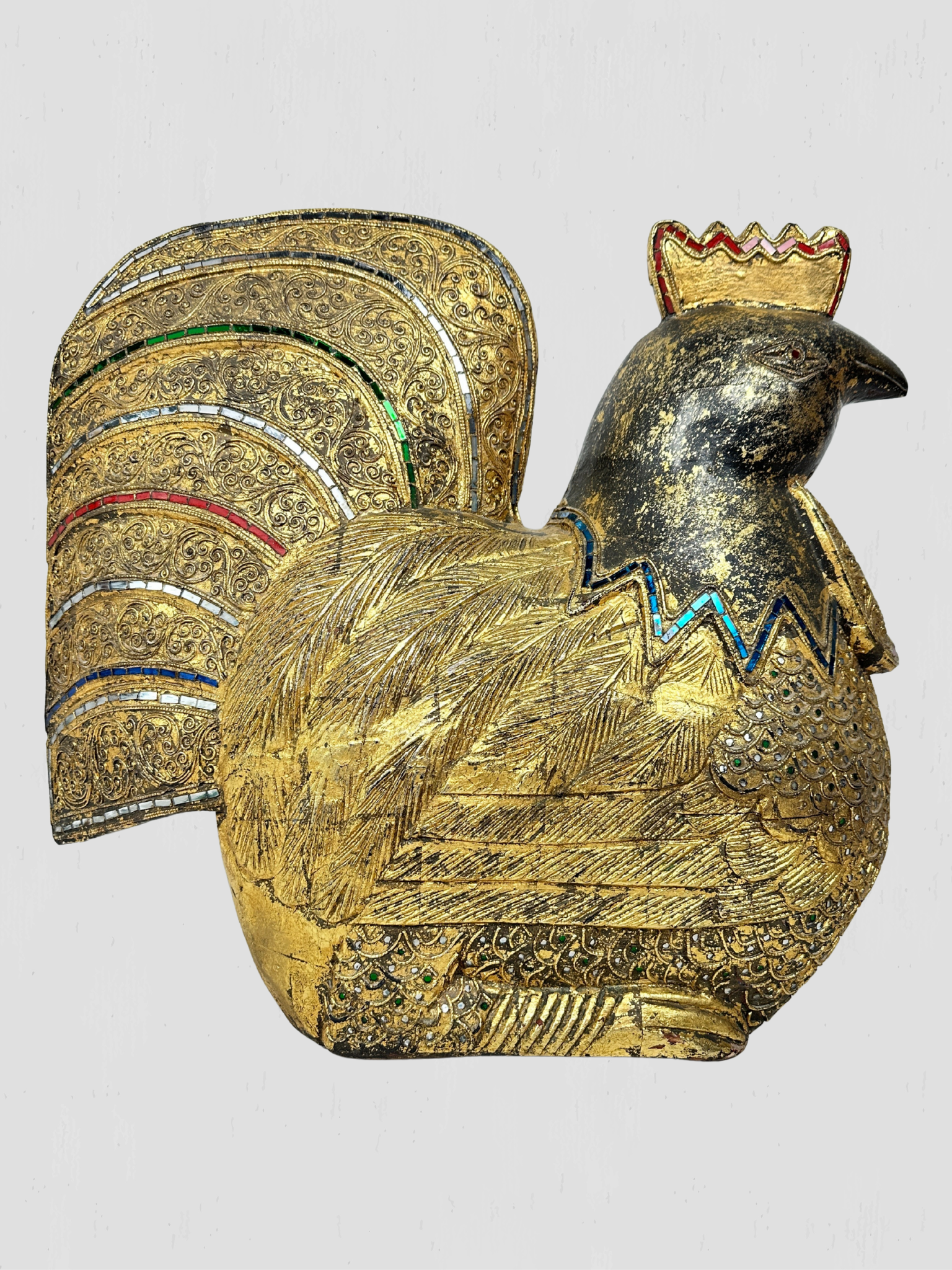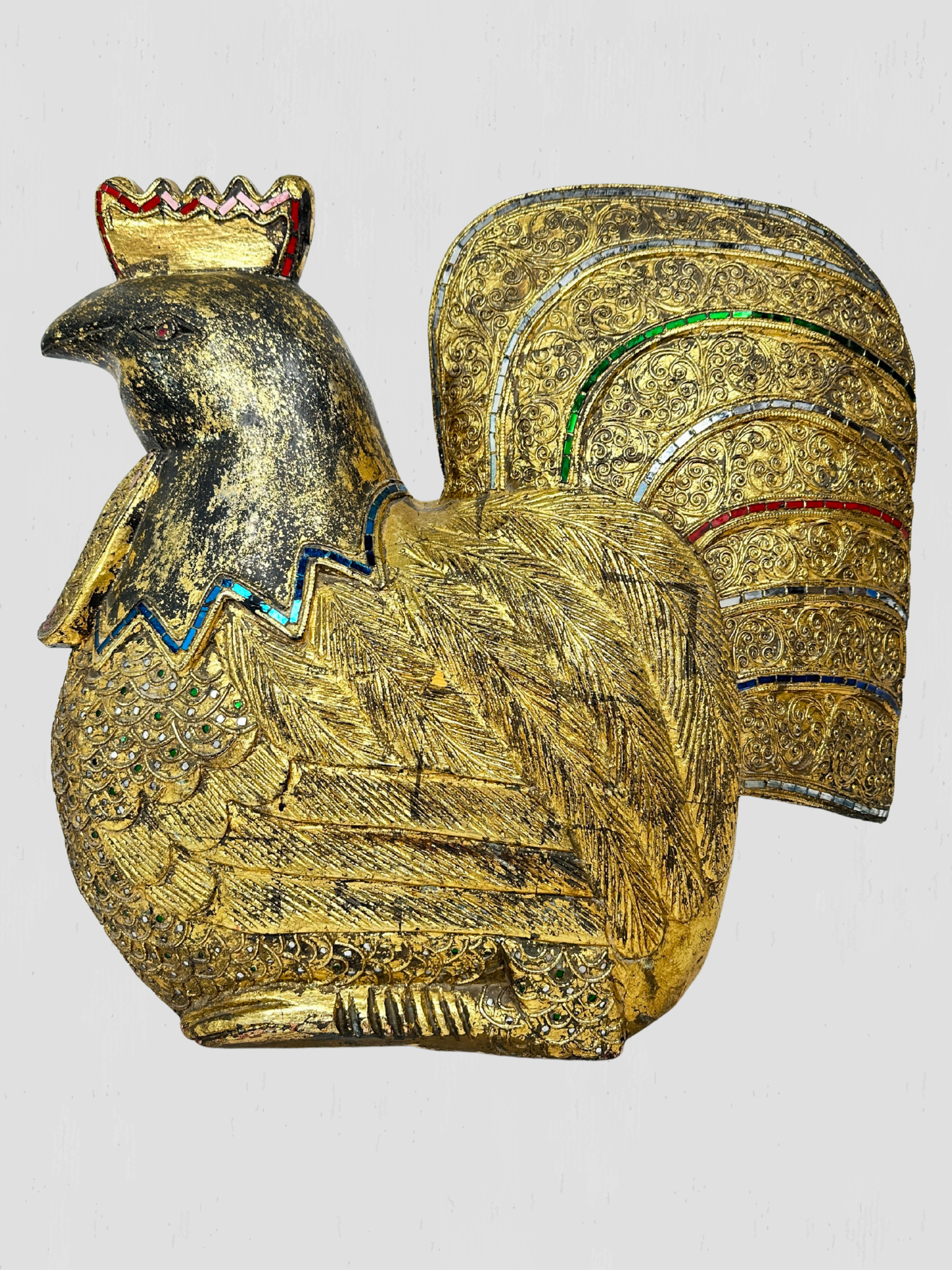 Beautiful vintage solid wood hand carved golden rooster. Inset multi-color mosaic glass accents on the eyes, feathers, neck and comb. Floral and foliate carved accents throughout.