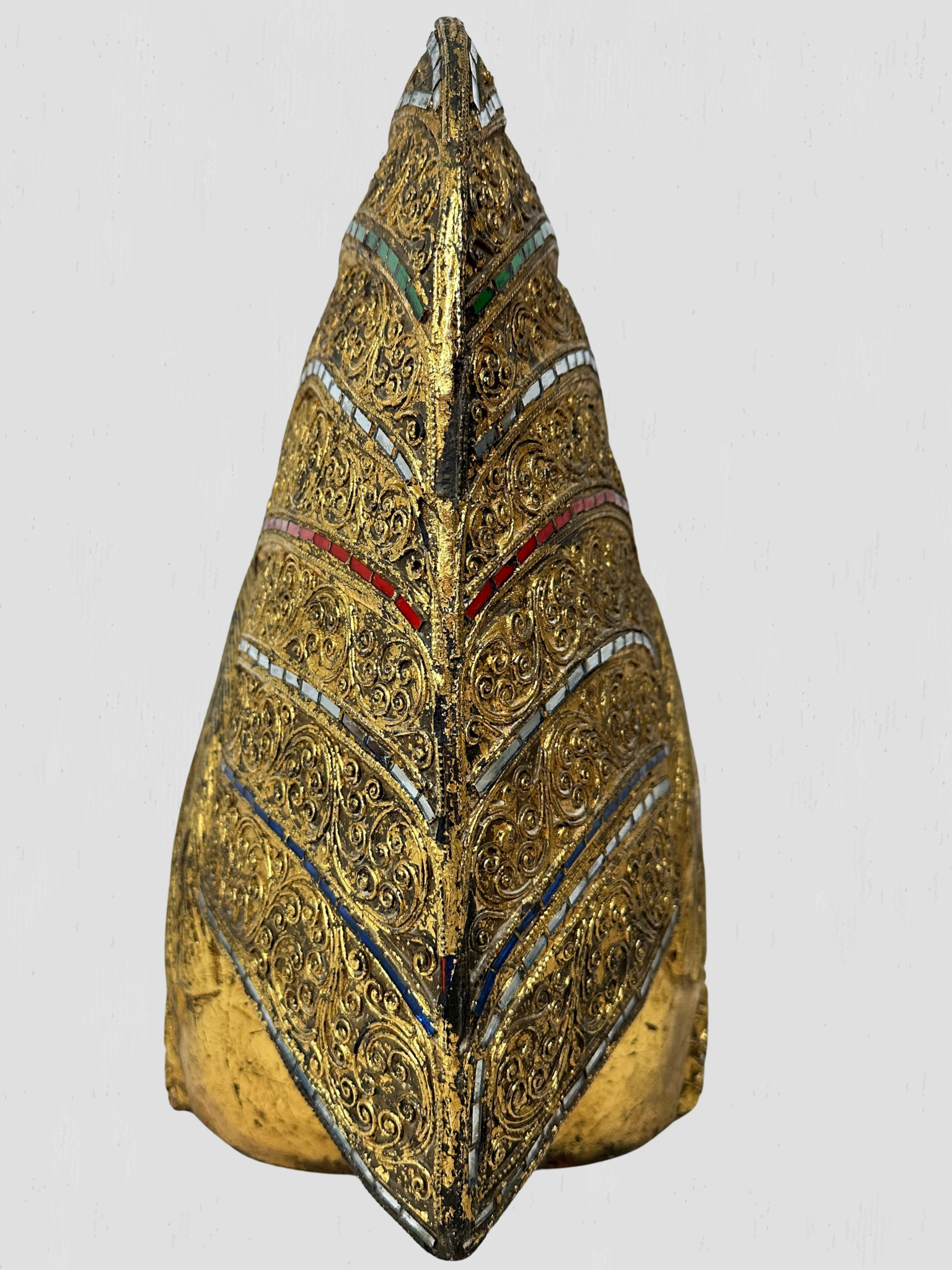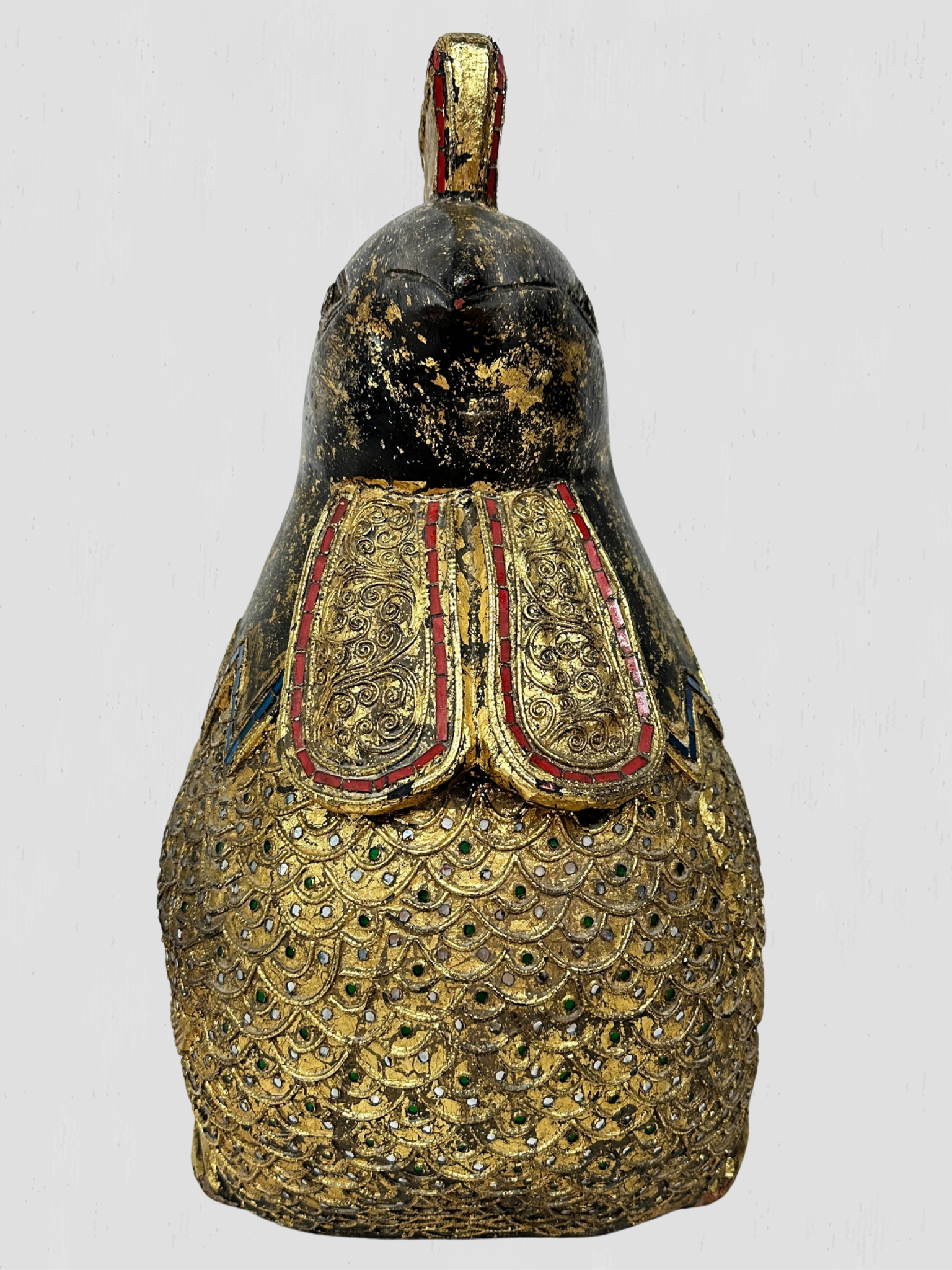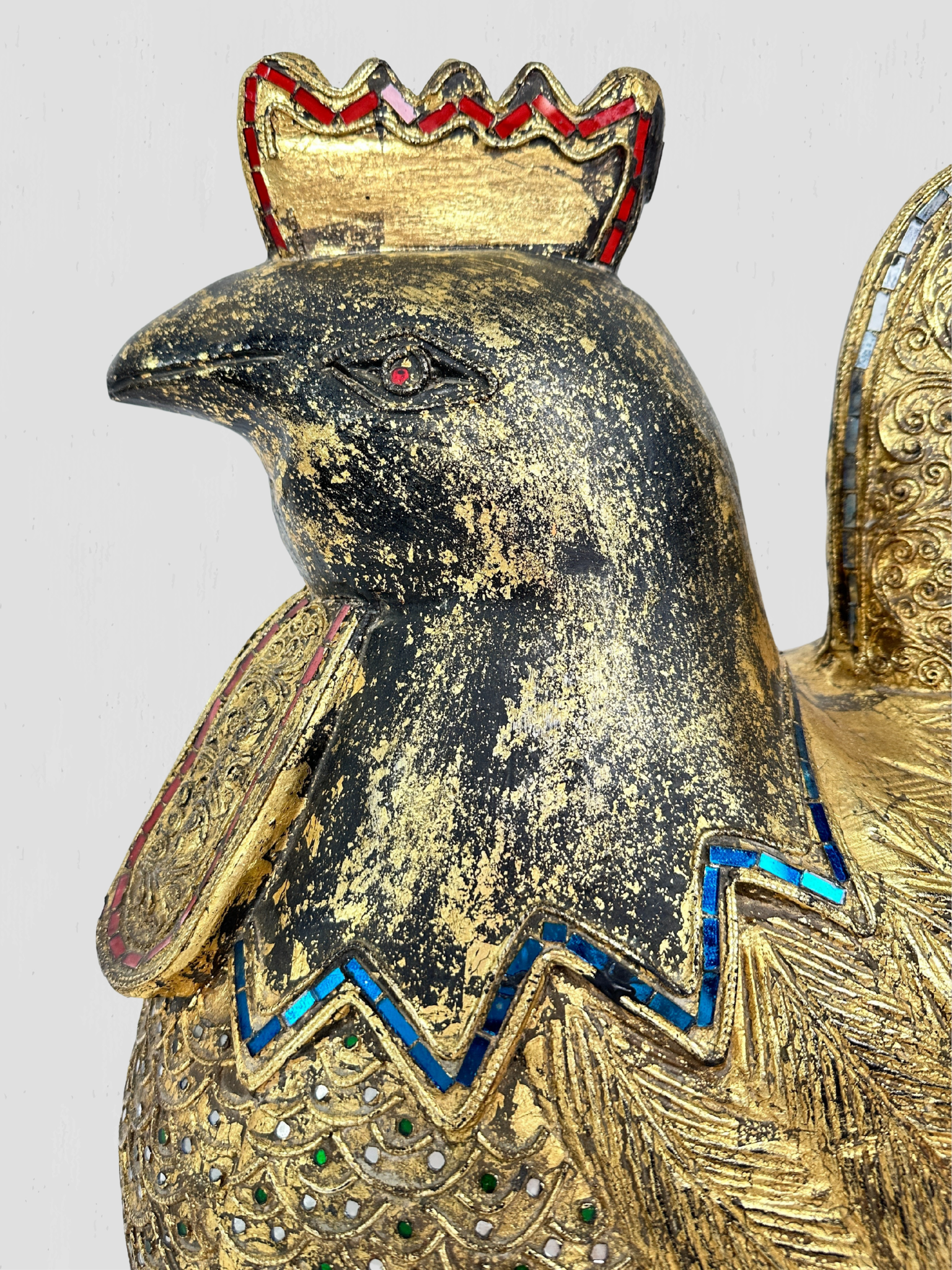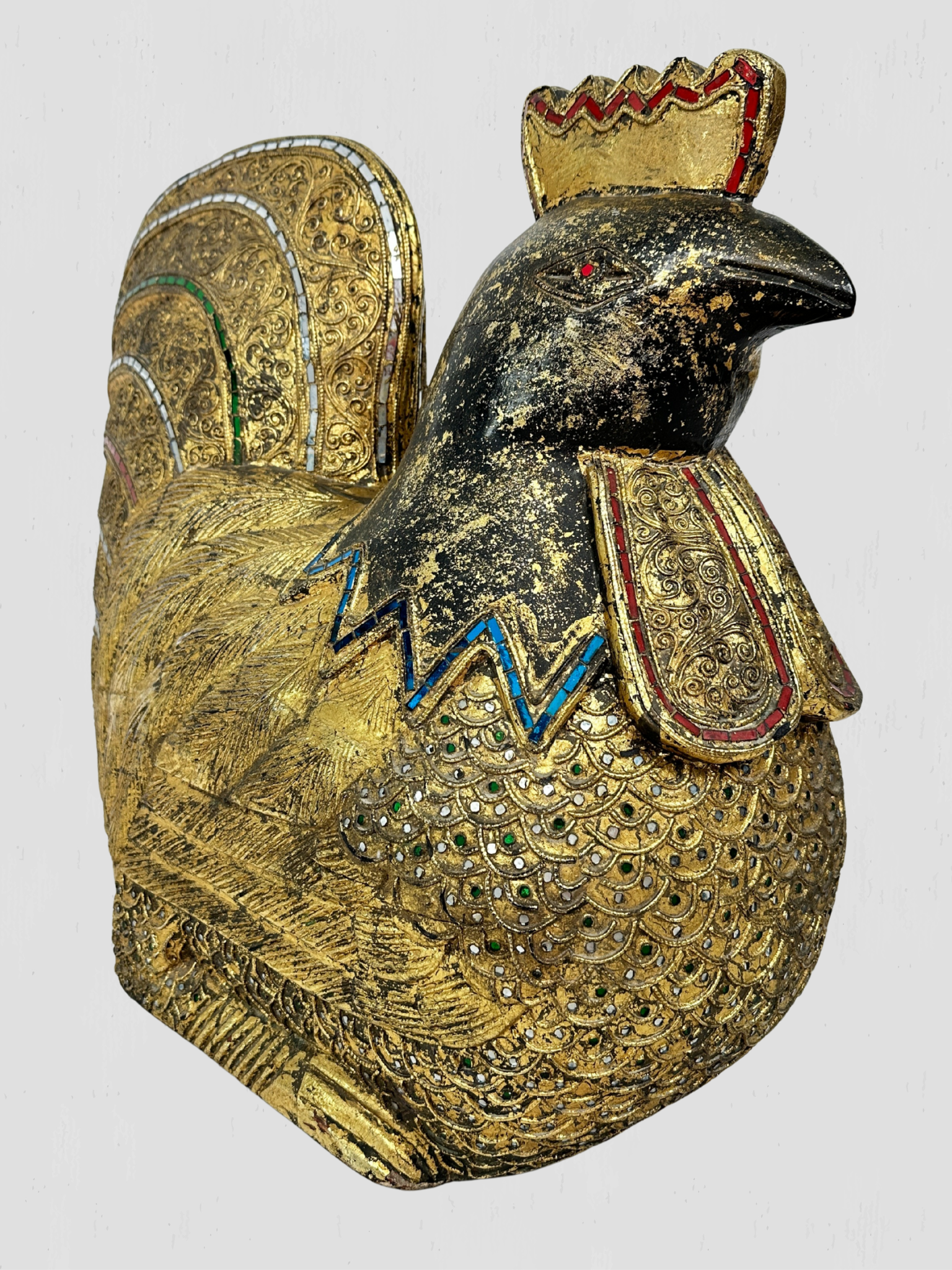 Beautiful vintage solid wood hand carved golden rooster. Inset multi-color mosaic glass accents on the eyes, feathers, neck and comb. Floral and foliate carved accents throughout.