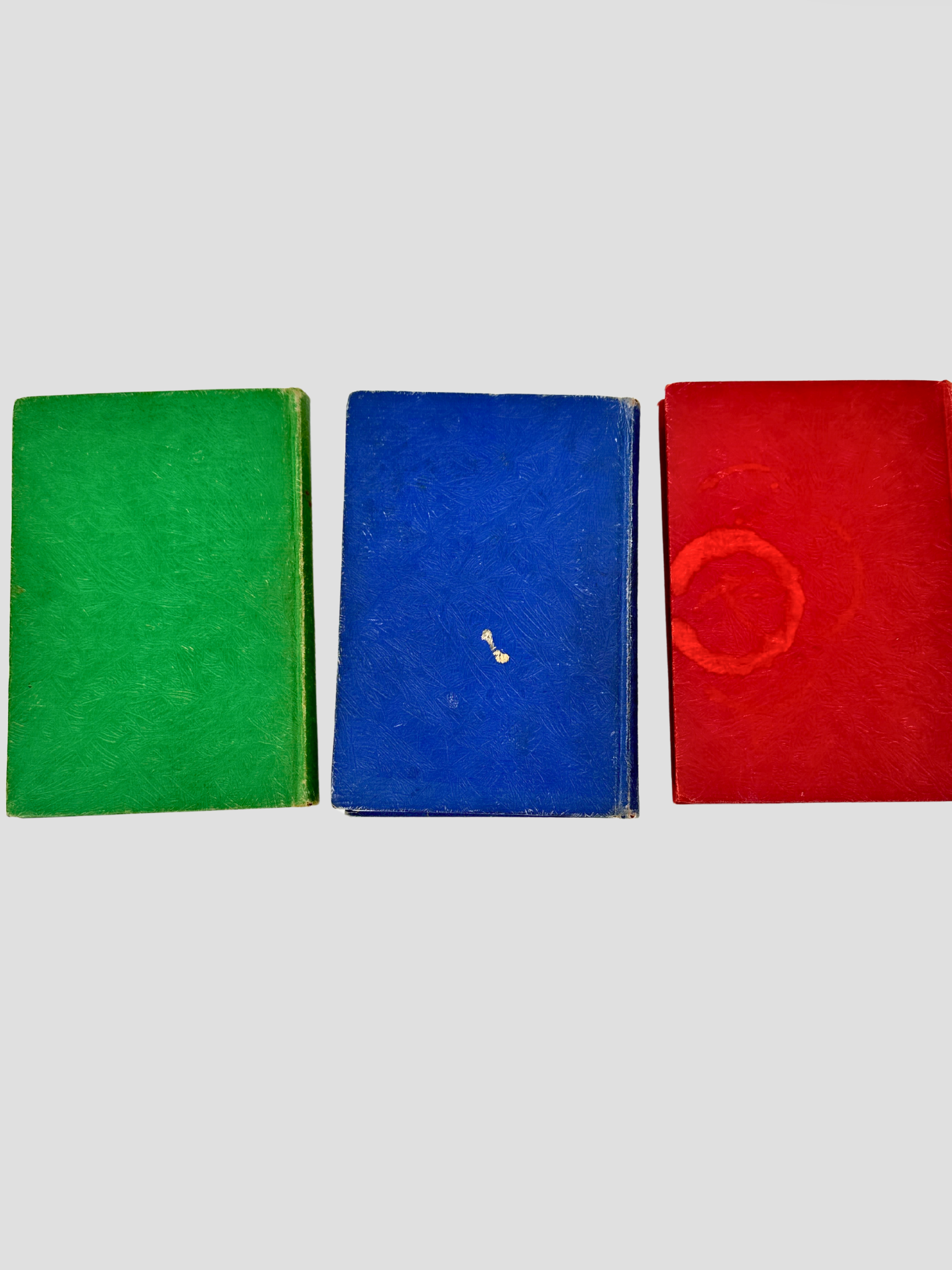 The spines are beginning to come loose on the books, but all are still intact. A content page is missing from the red book (volumes 1-4). All other pages seem to be present. Condition consistent with age and wear. Overall, they are in good condition