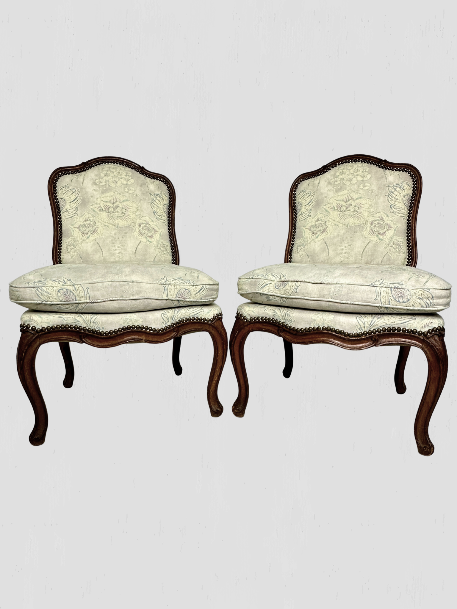 French Slipper Chair Carved Exposed Frame Floral Linen Pair
