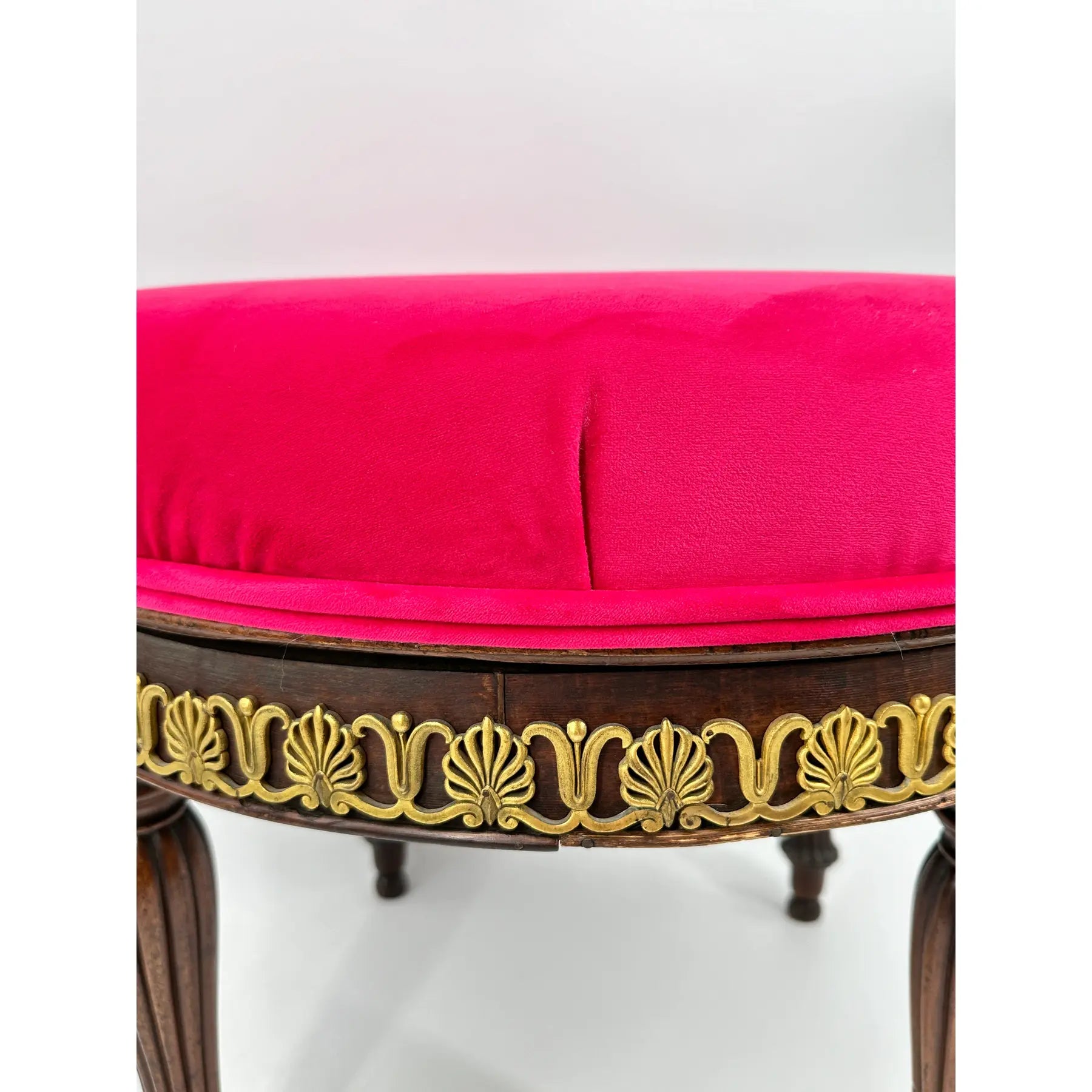 French Empire Mahogany Revolving Stool with Brass Mounts. Newly upholstered in a raspberry pink velvet. Standing on carved tapered legs. A lovely piece.