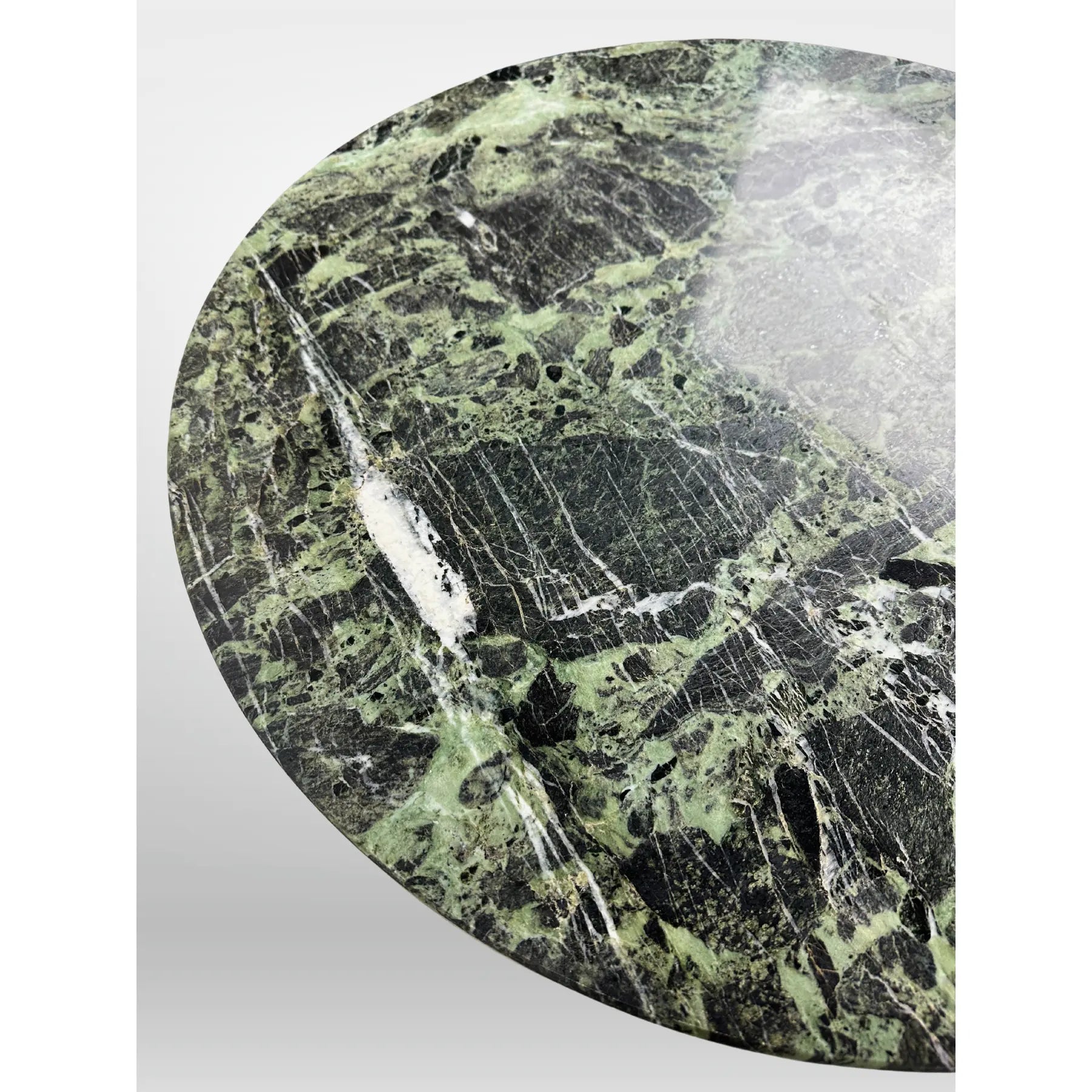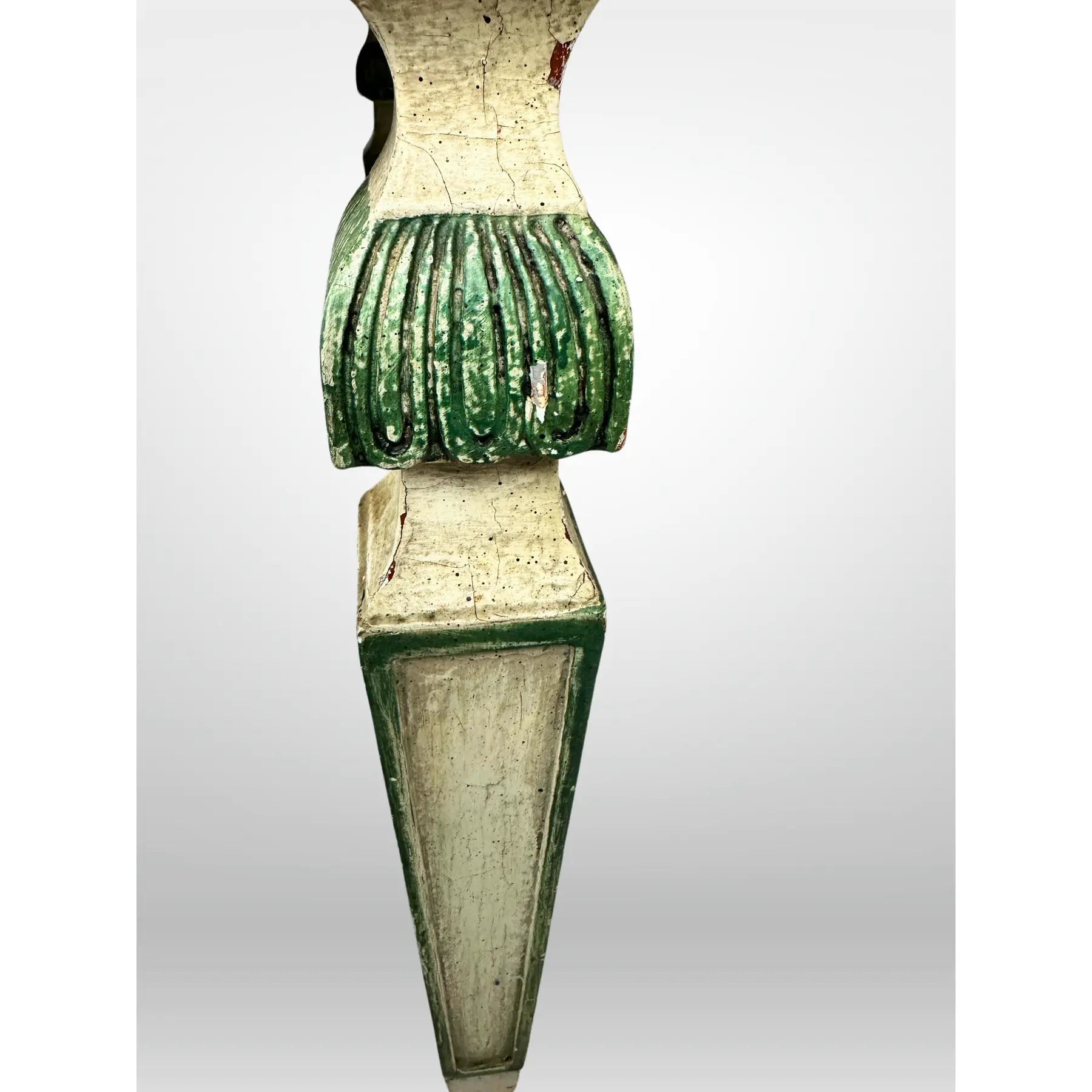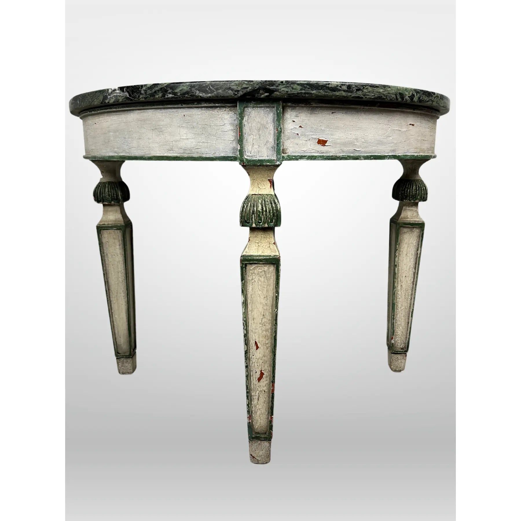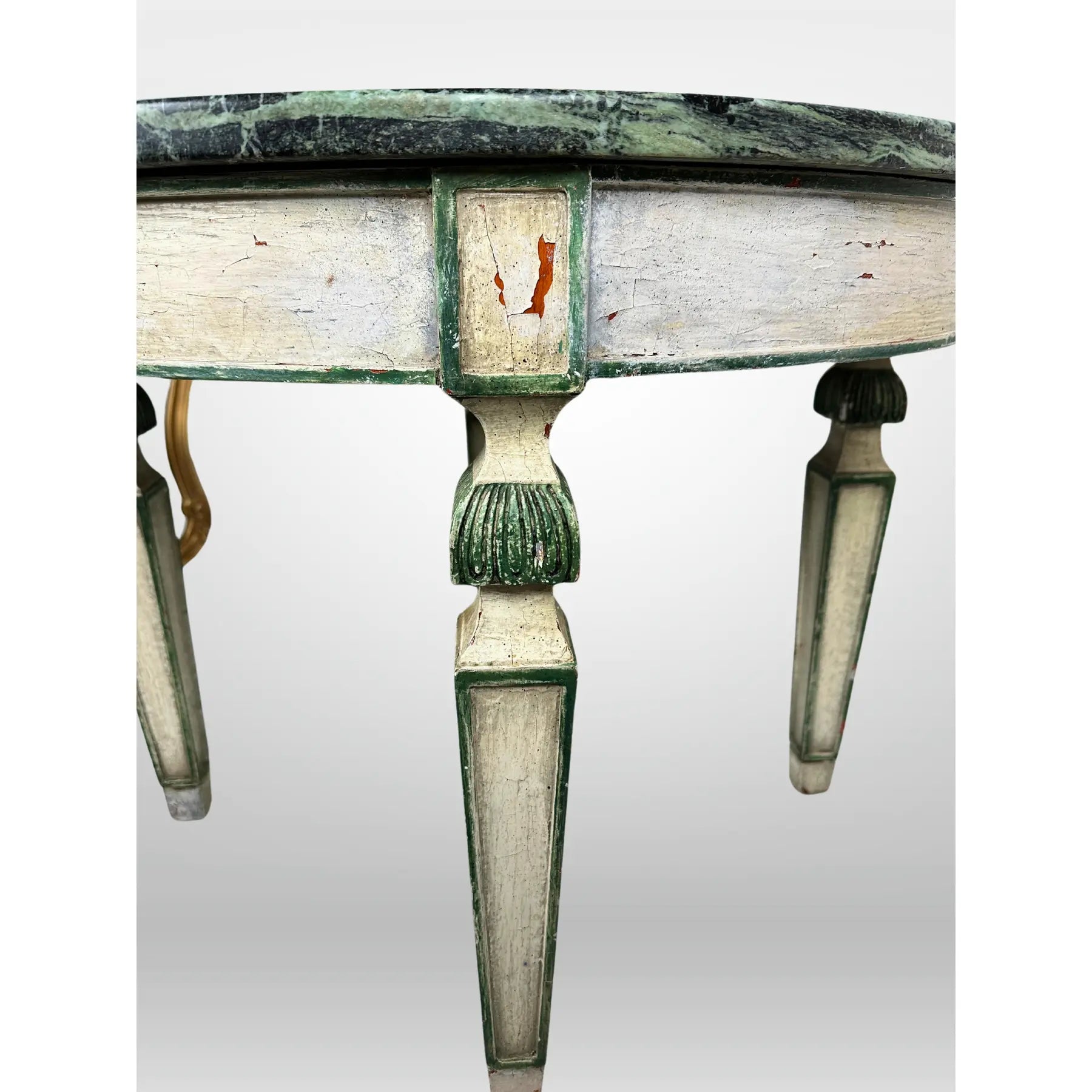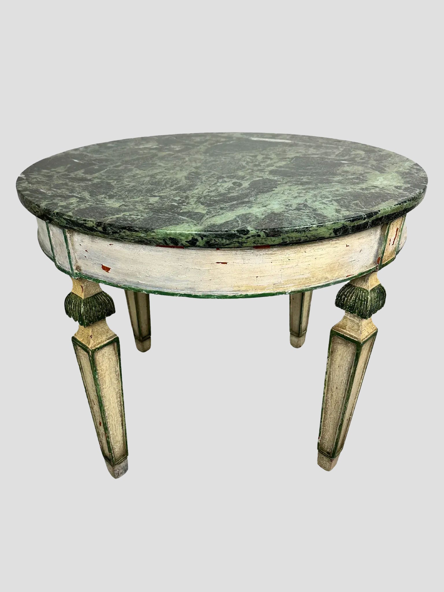Beautiful Italian round table with a lovely green marble top. Cream painted base with green outline. Standing atop carved tapered legs. The marble slab detaches from the base for transport.