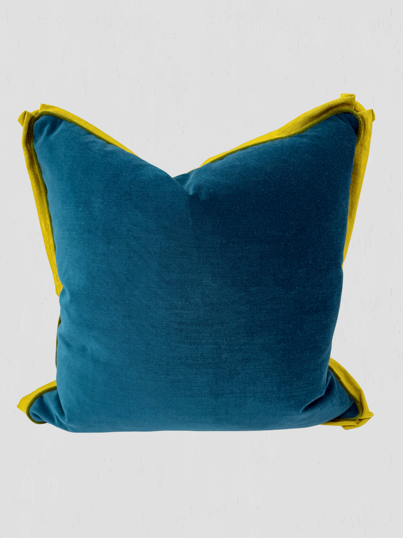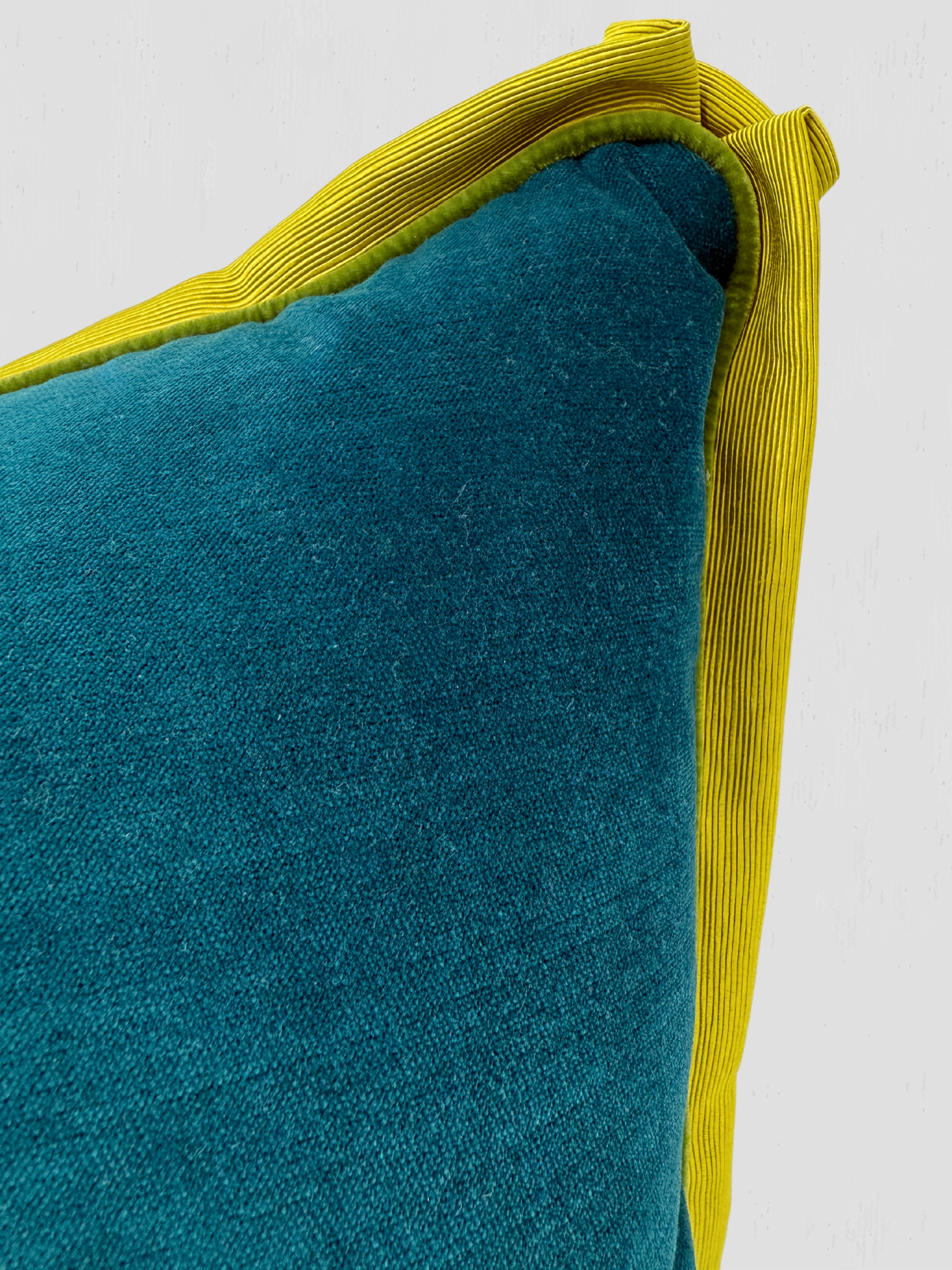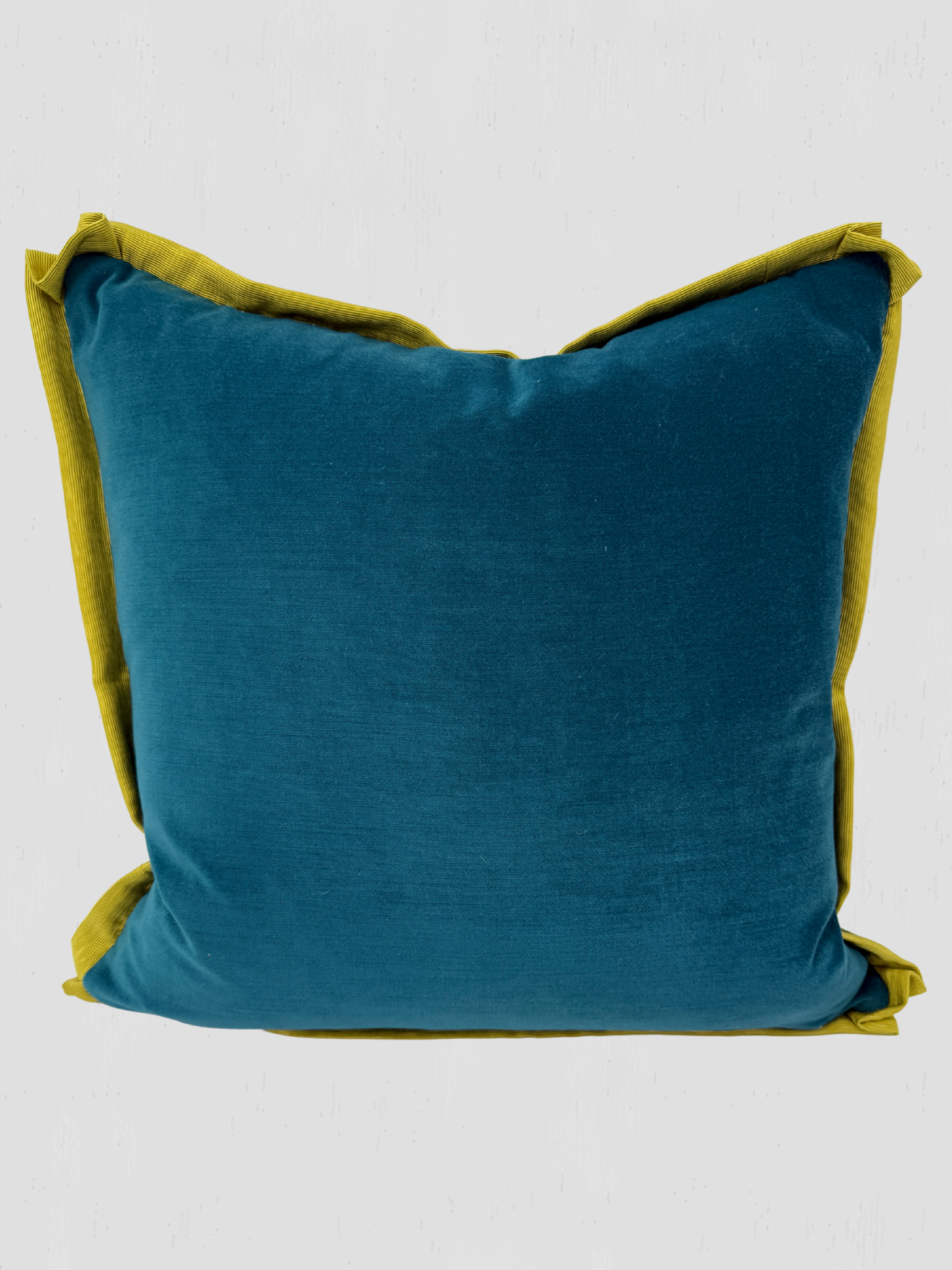 Teal DeLeo Velvet, Chartreuse Mitered Flange, Samuel & Sons Green Velvet Cord. Down blend insert. Hidden zipper closure. 20" X 20".