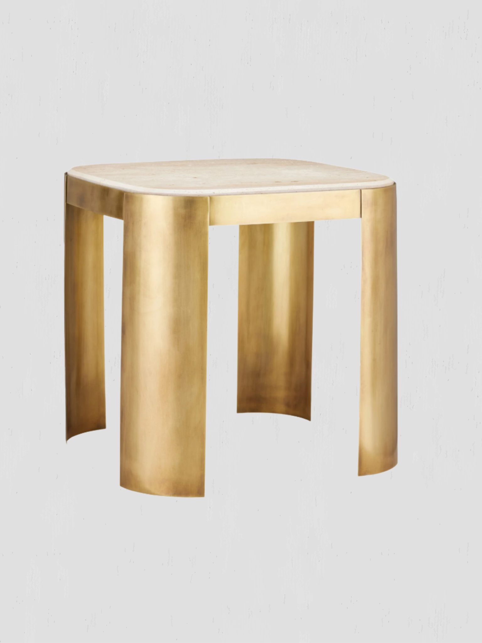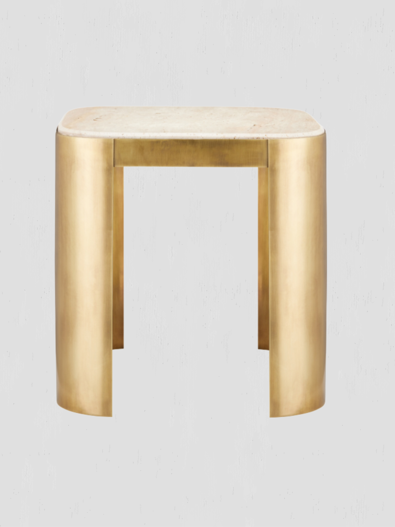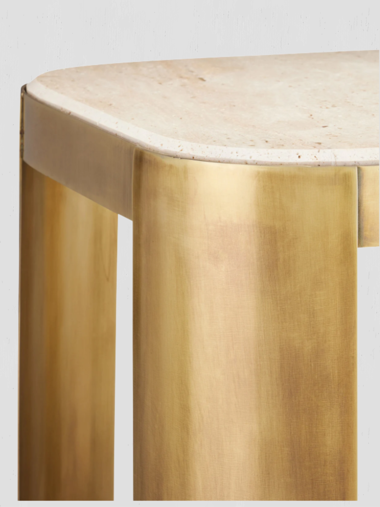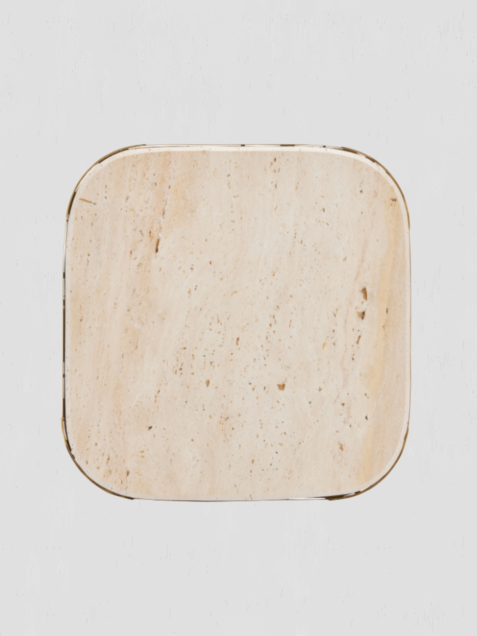 The Sev Travertine Accent Table has a shape that looks back to the past but with forward-thinking finishing techniques. The stainless steel table with a contemporary shape has a gold finish. The natural travertine top sits proud so it will always stay in place. Due to the nature of travertine, there will be color and texture variations.