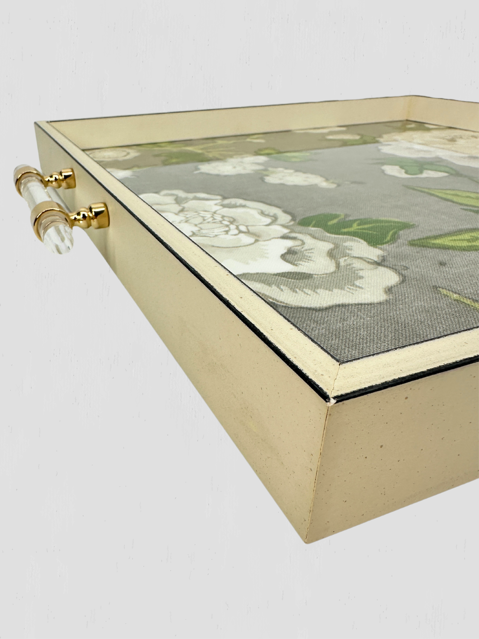 Gray white and green floral print tray in cream frame. Lucite handles.