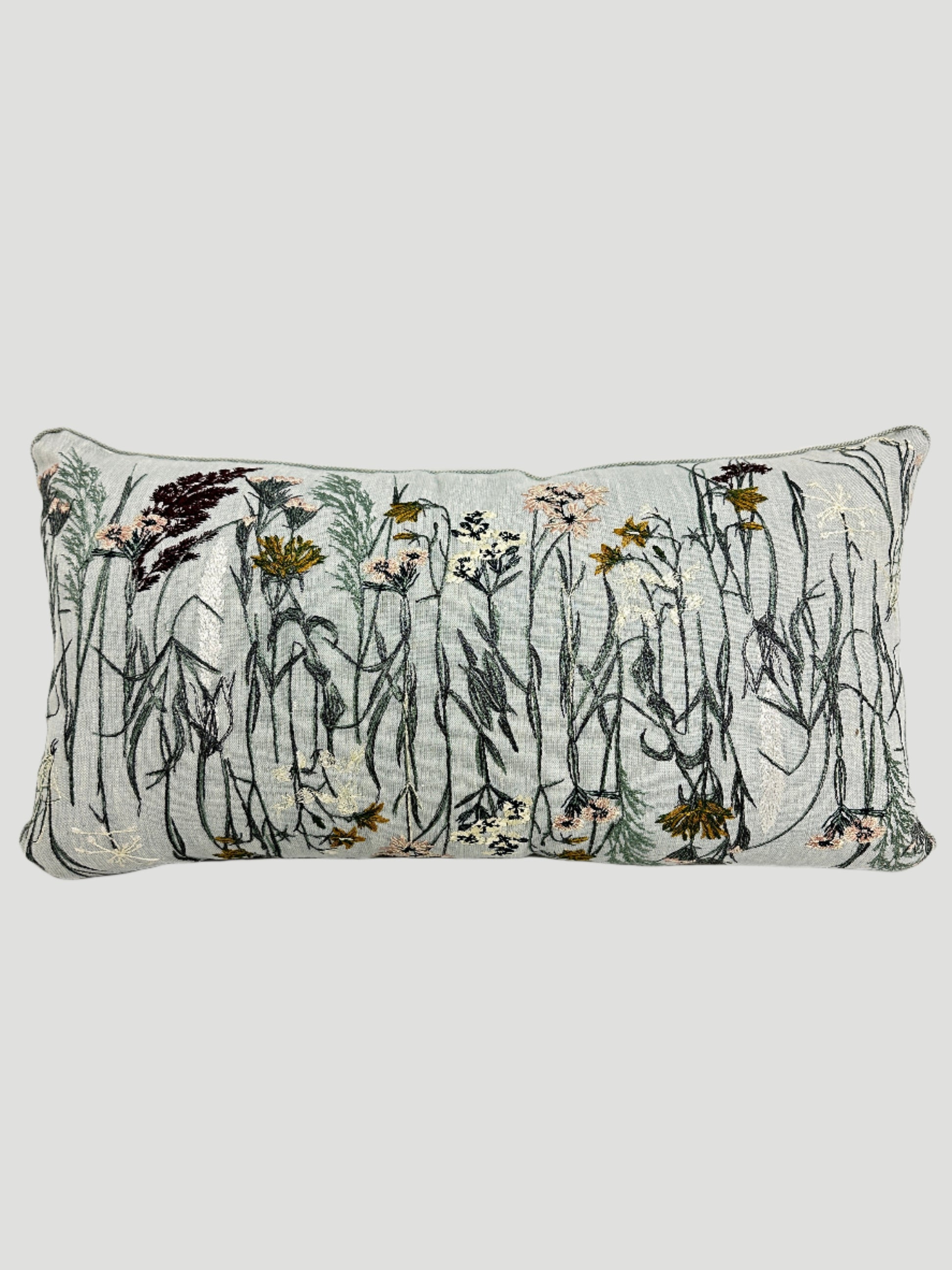 Custom made pillow pair featuring a stunning Sanderson embroidered floral fabric front. White linen back with blue vertical velvet ribbon detail. Light blue cord. 22" x 12". Hidden zipper closure. Down blend insert.
