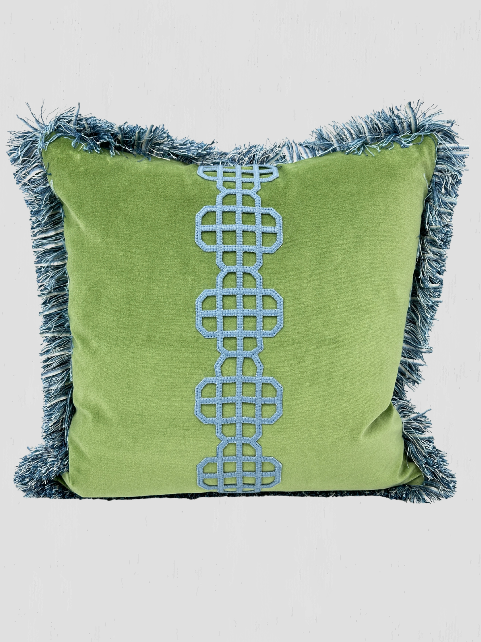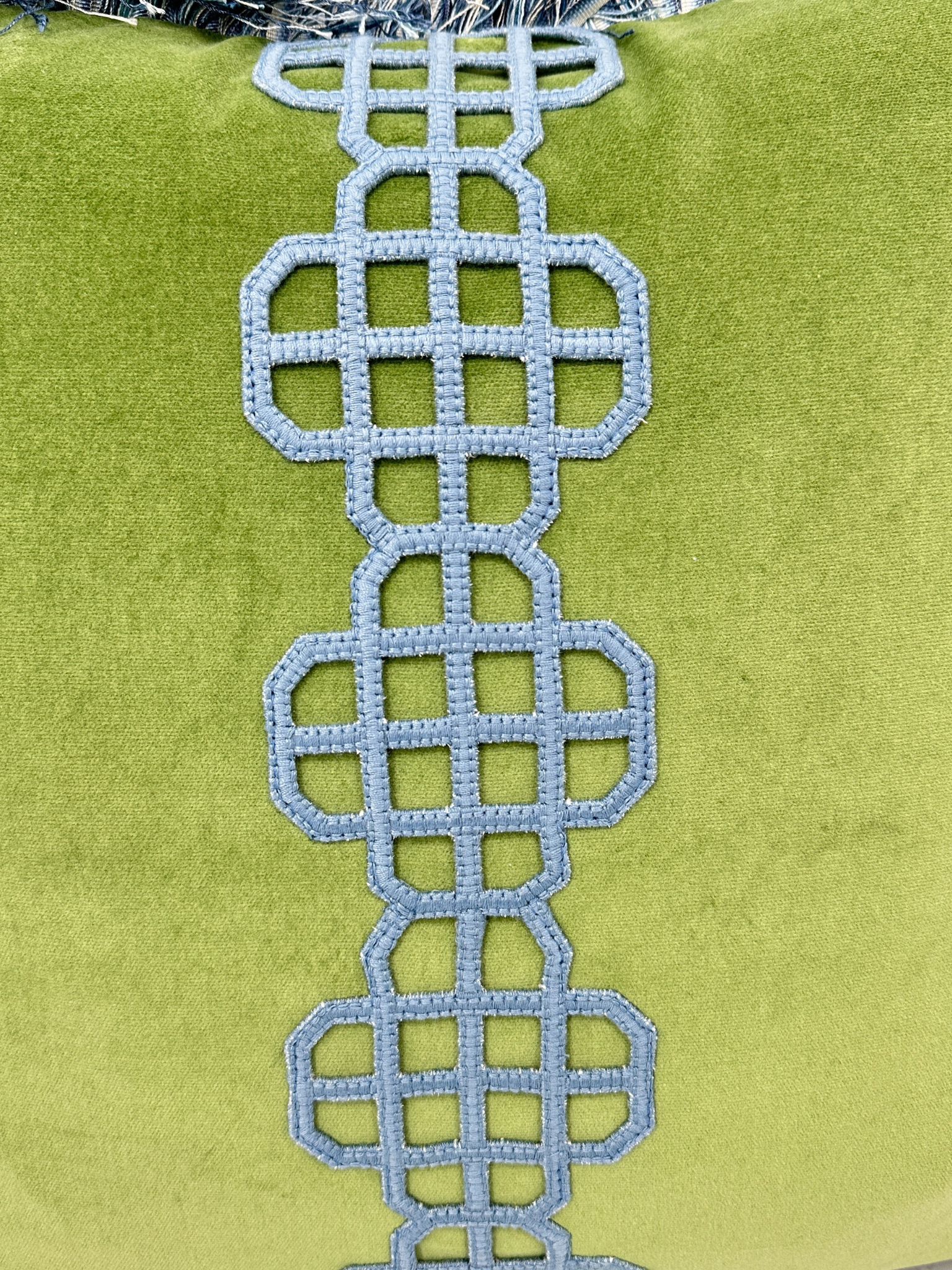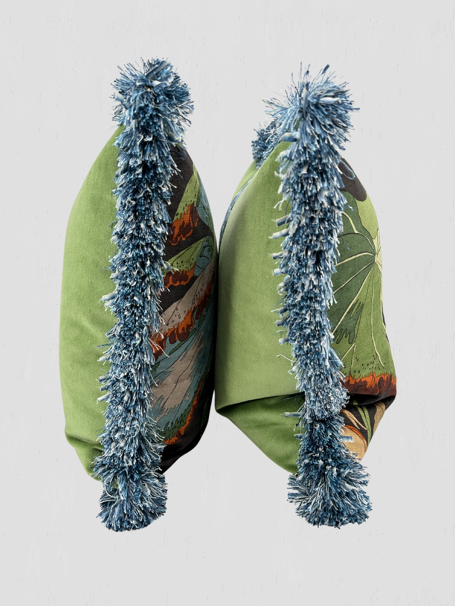 Pillow Pair custom made in GP&J Baker Nympheus Charcoal Velvet Front, Green Velvet Back, Thibaut Tape, Blue Brush Fringe.