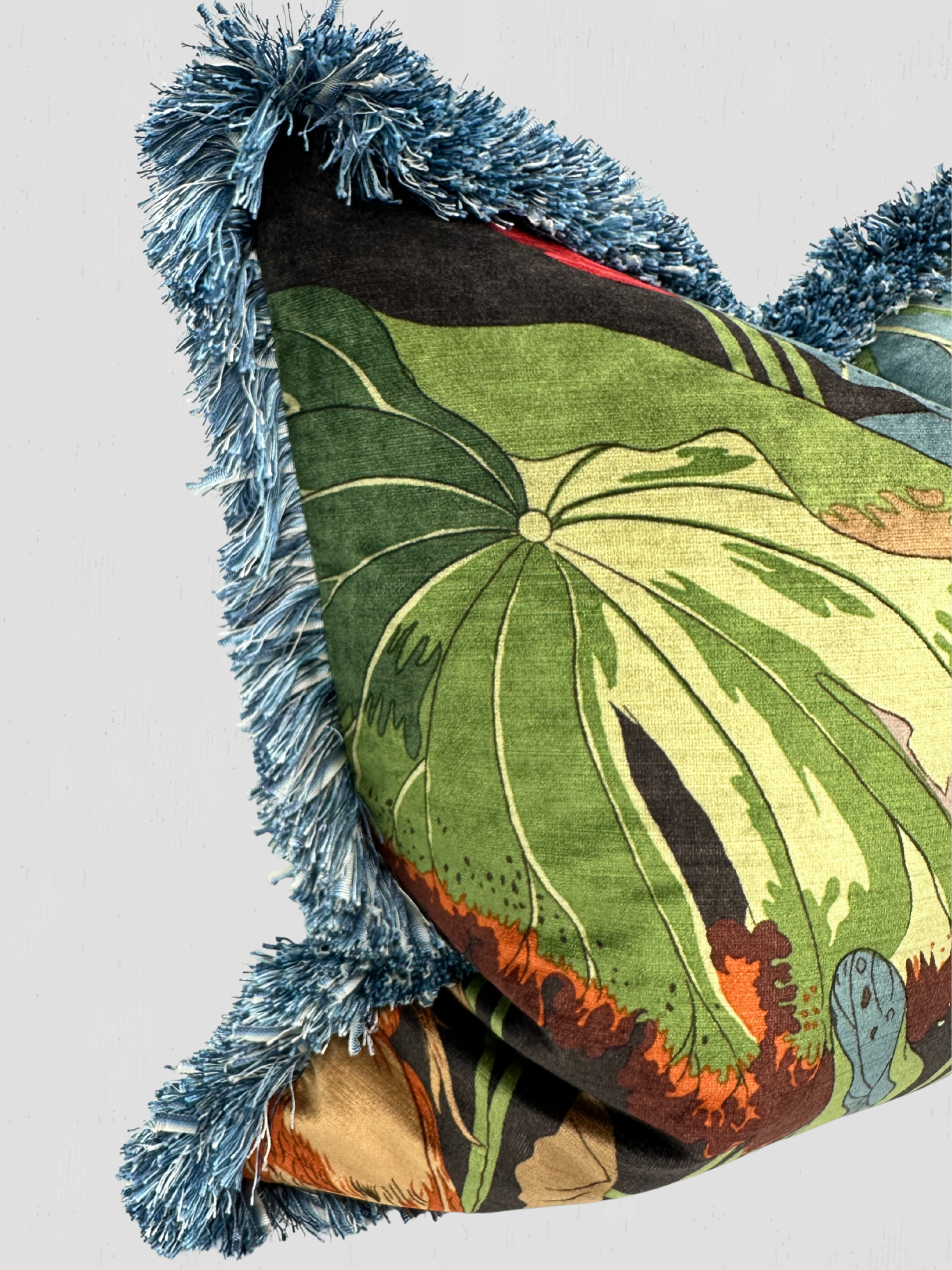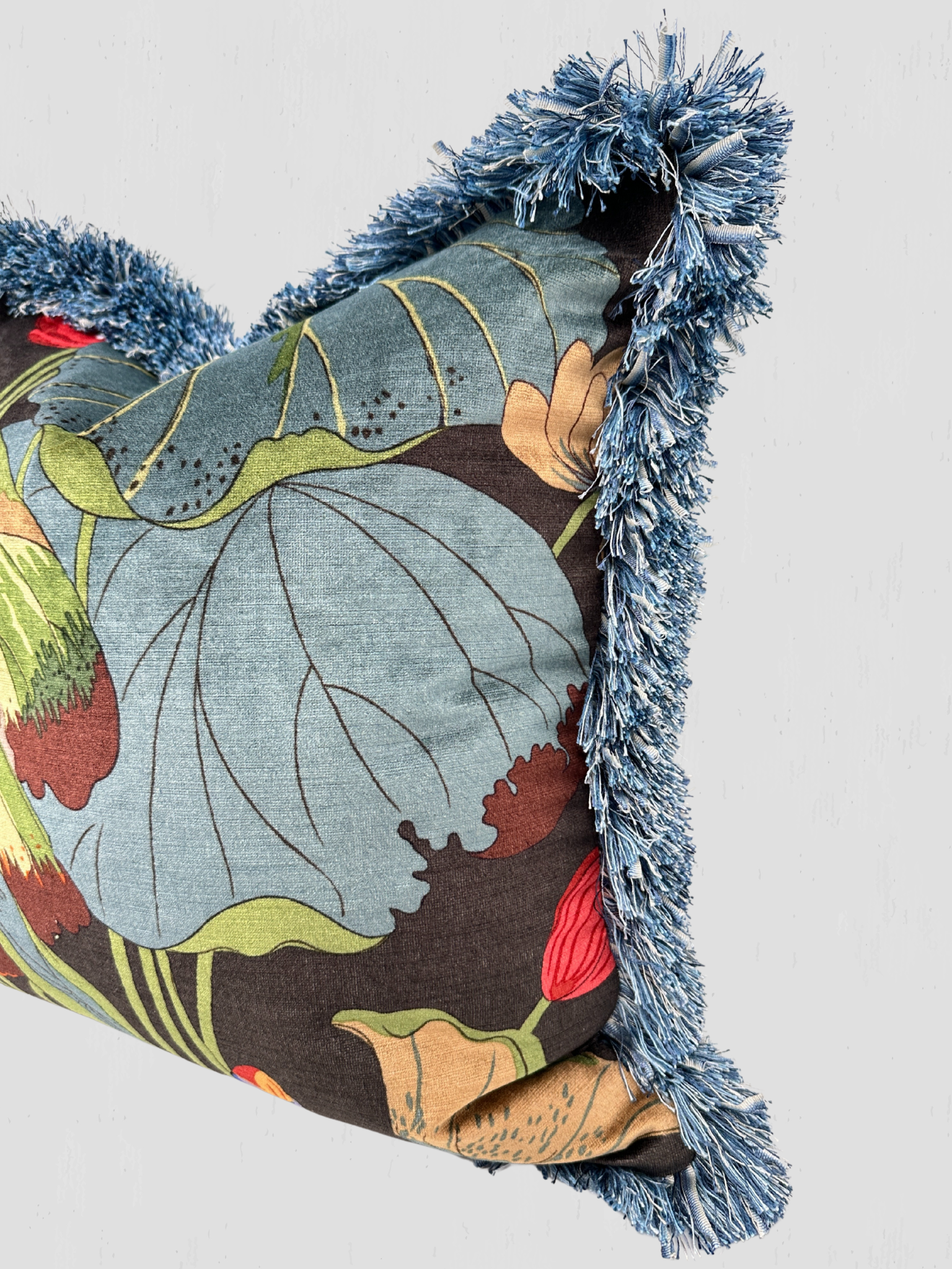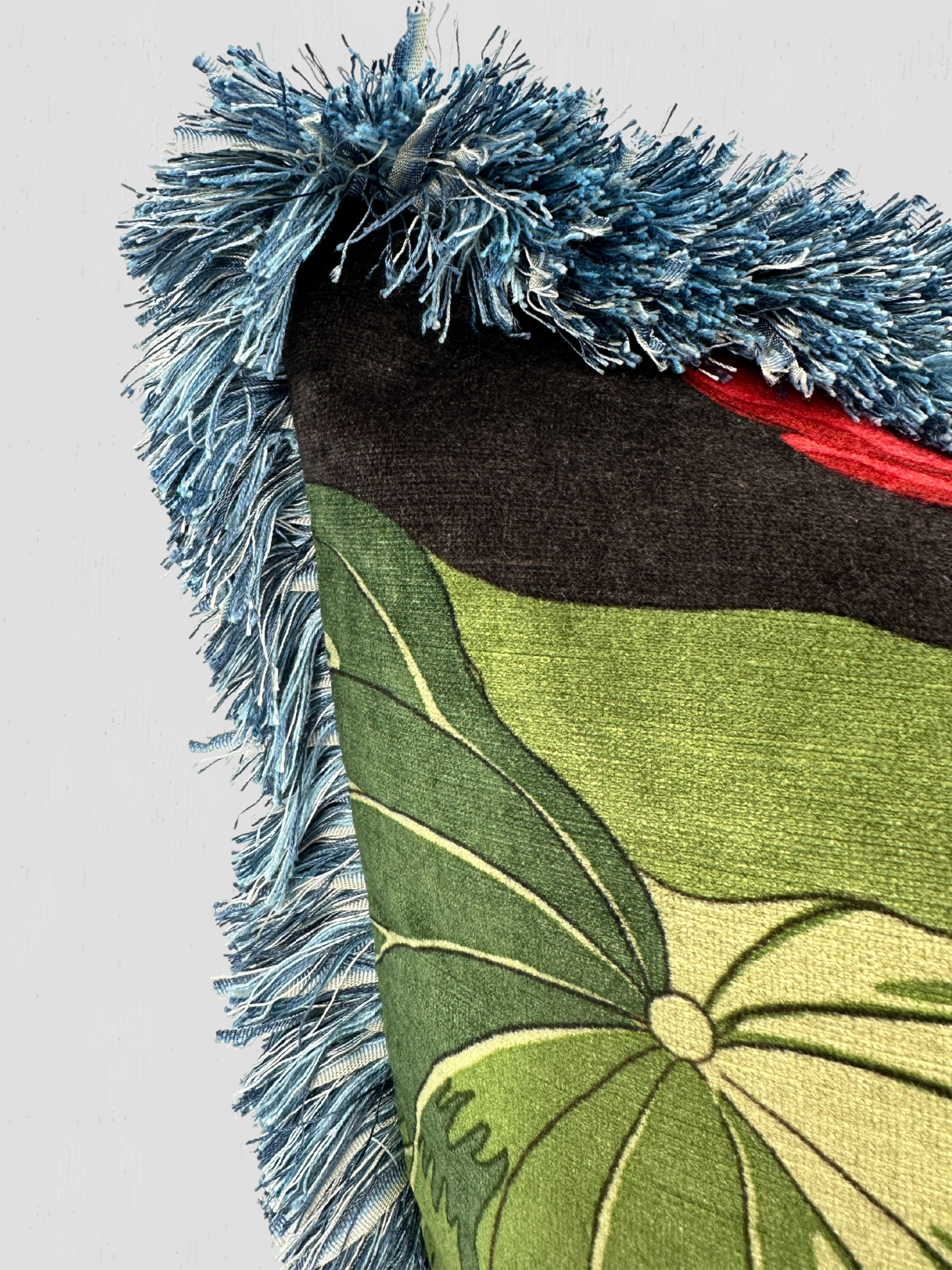 Pillow Pair custom made in GP&J Baker Nympheus Charcoal Velvet Front, Green Velvet Back, Thibaut Tape, Blue Brush Fringe.