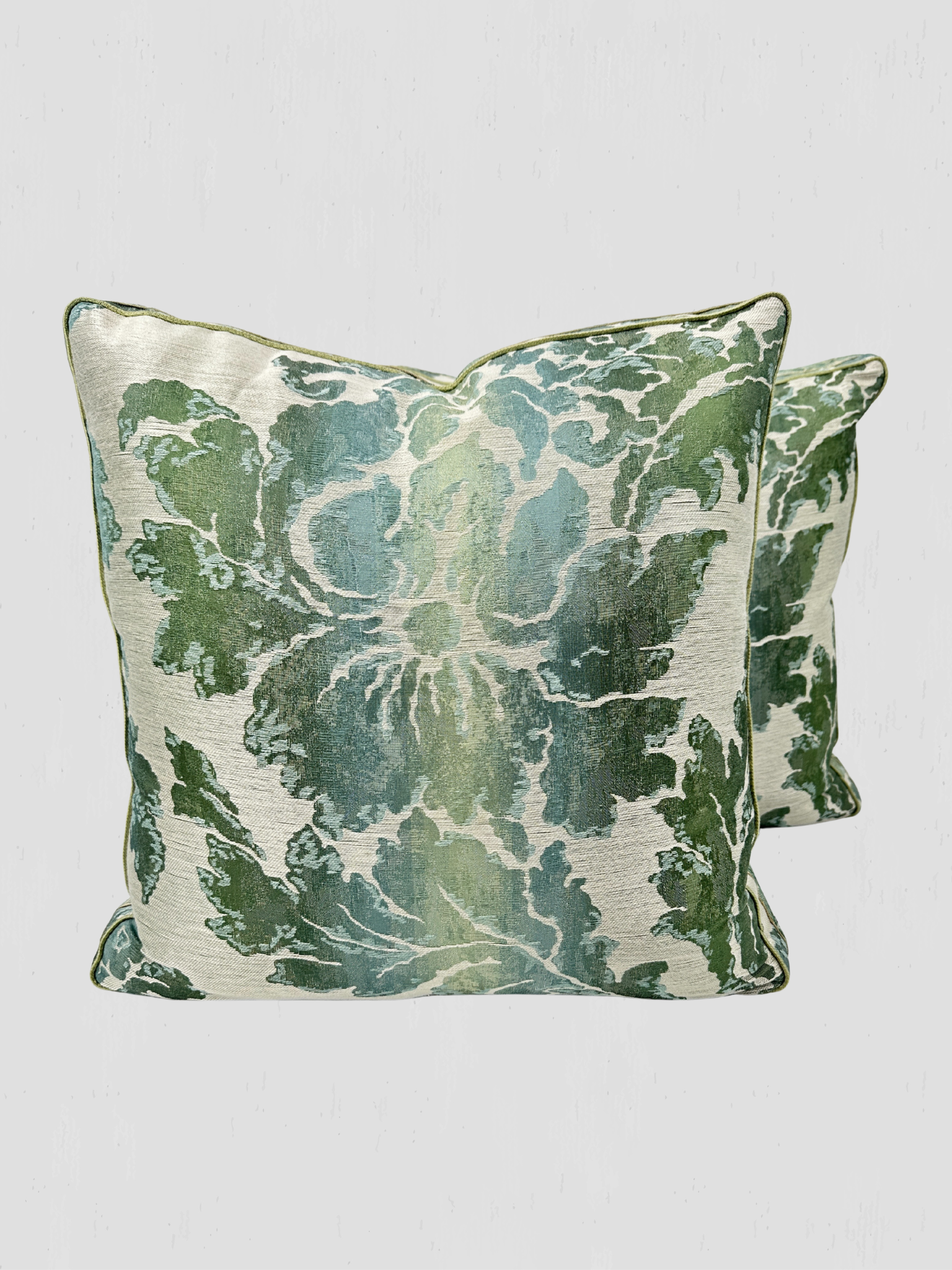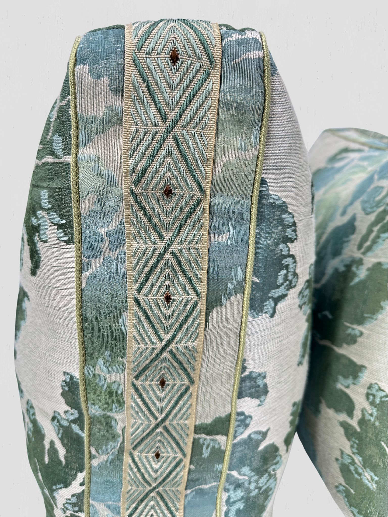 Stunning custom made box pillow pair. Colefax & Fowler Lucius in Aqua. Samuel & Sons tape and cording. Down blend insert. Hidden zipper closure. 22" X 22".