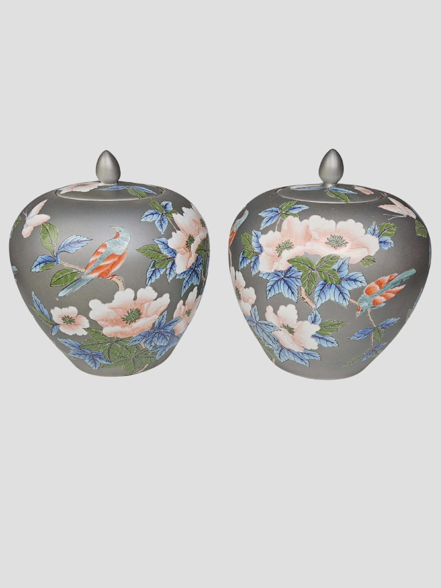 A lovely pair of vintage porcelain ginger jars with lids. Two aesthetically striking jars, made in Macau, are enhanced by the matte gray background and the fine detail of the birds and flora.
