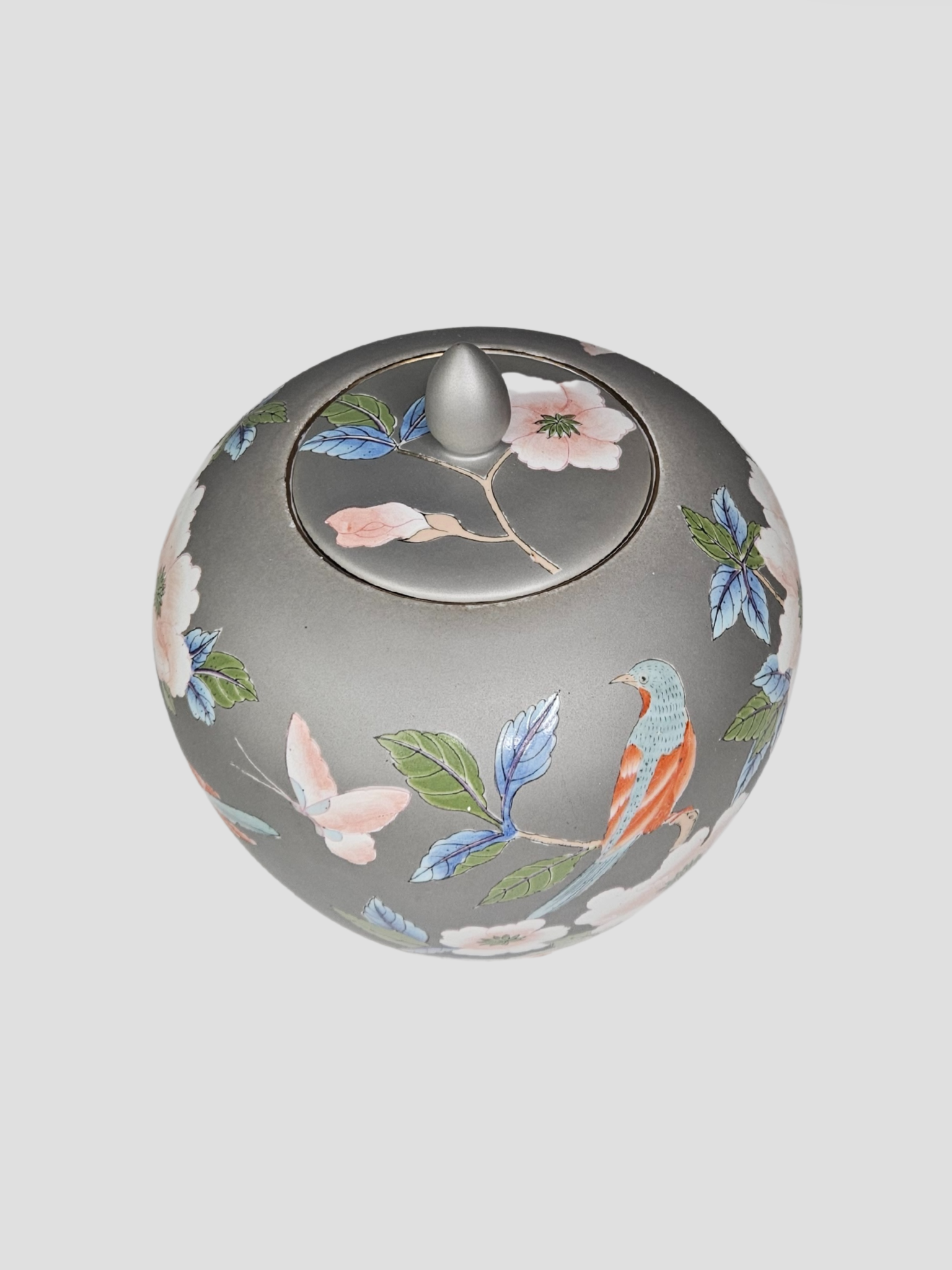 Gray Field Macau Ginger Jars With Multicolor Flora Birds Pair
